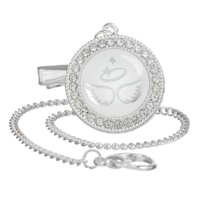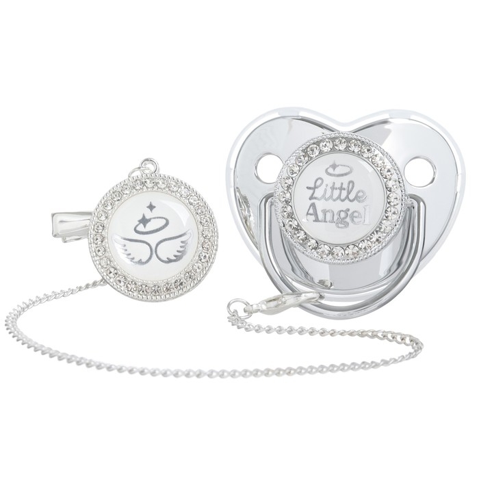Соска - пустышка силиконовая ортодонтическая «LITTLE ANGEL», от 6 мес., с колпачком + держатель - цепочка, цвет серебренный, стразы