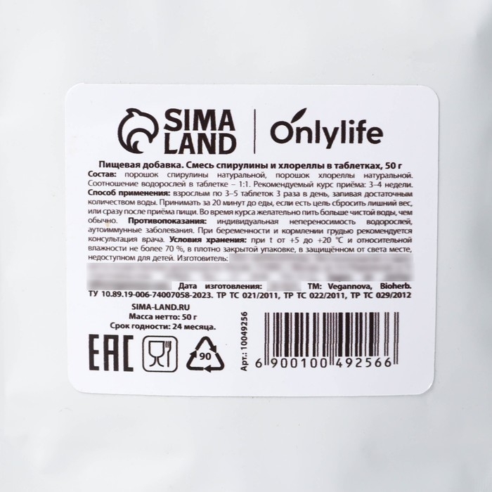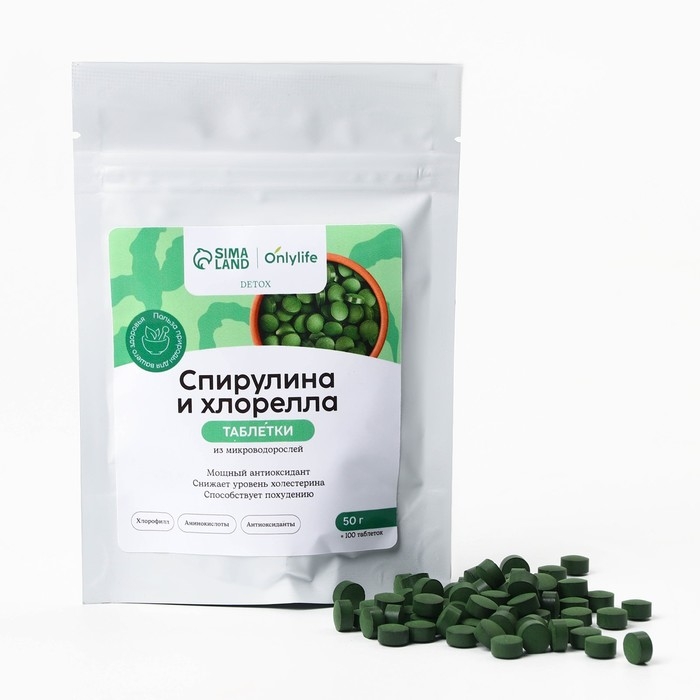 Спирулина и хлорелла, для иммунитета и похудения, в таблетках, 50 г.