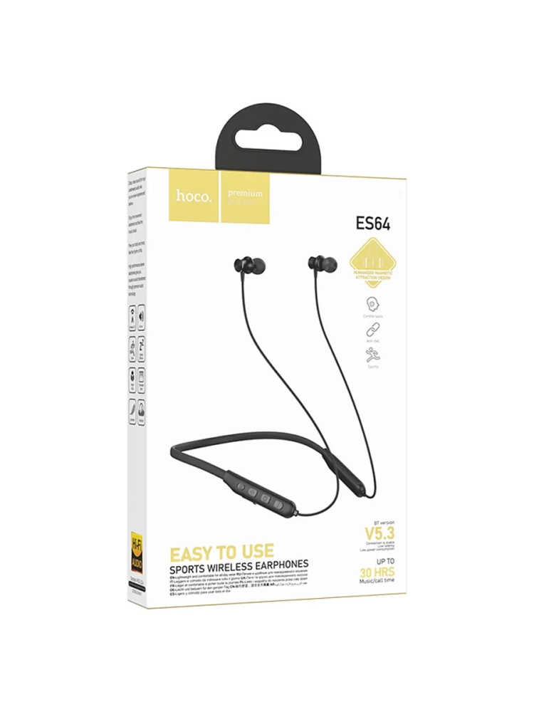Наушники беспроводные для музыки и спорта с шейным ободом с микрофоном Hoco ES64. Главное преимущество наушников - полное отсутствие проводов. Наушники отлично подойдут для занятий спортом. Таким как бег и фитнес. Данная модель блютуз наушников оснащена: микрофоном. Обеспечат комфорт при прослушивании музыки и аудиокниг. Спортивные наушники с функцией магнитного притяжения предотвращают их запутывание и уберегут вас от потери. Наушники с микрофоном обладают невероятно четким качеством звука. Полной зарядки батареи хватает на 30 ч прослушивания и разговора: 30 часов работы и 350 часов в режиме ожидания. Общая длина - 96 см, вес - 26,5 грамм. Поддержка воспроизведения Bluetooth 5.3. Поддержка китайского и английского тональных сигналов: дважды щелкните многофункциональную клавишу в непарном состоянии. Батарея 200 мАч, быстрая зарядка внутриканальных наушников занимает около 2,5 часов.