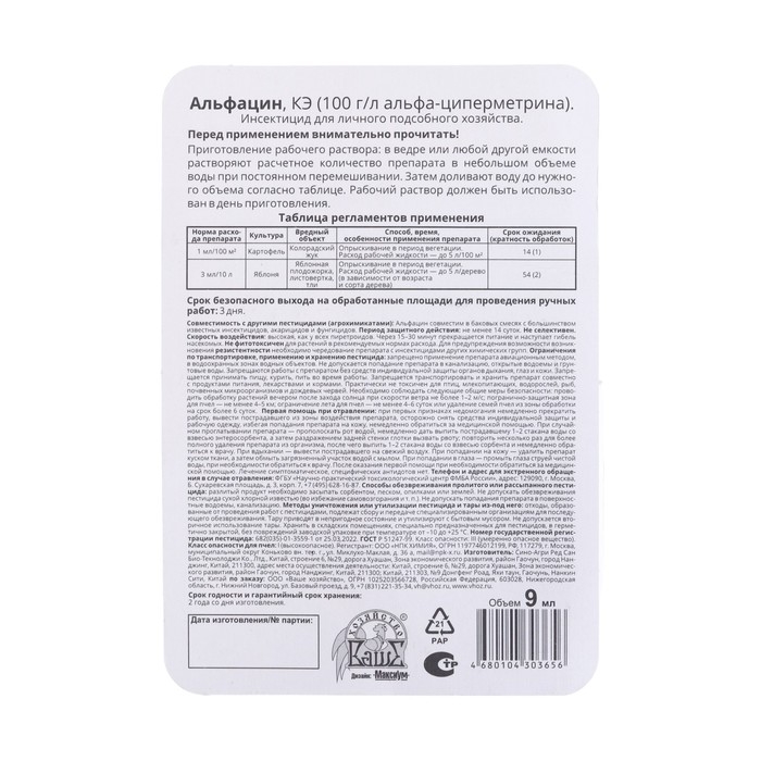 Альфацин, КЭ (100 г/л альфа-циперметрина).Инсектицид для личных подсобных хозяйств.Совместим в баковых смесях с большинством известных инсектицидов, акарицидов и фунгицидов.Период защитного действия: не менее 14 суток. Не селективен. Приготовление рабочего раствора: в ведре или любой другой емкости растворяют расчетное количество препарата в небольшом объеме воды при постоянном перемешивании. Затем доливают воду до нужного объема согласно таблице. Рабочий раствор должен быть использован в день приготовления.
