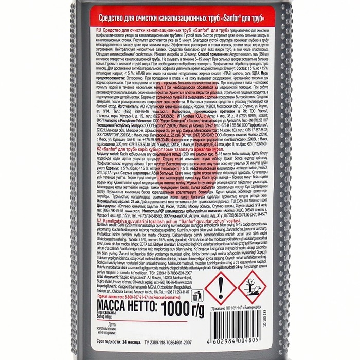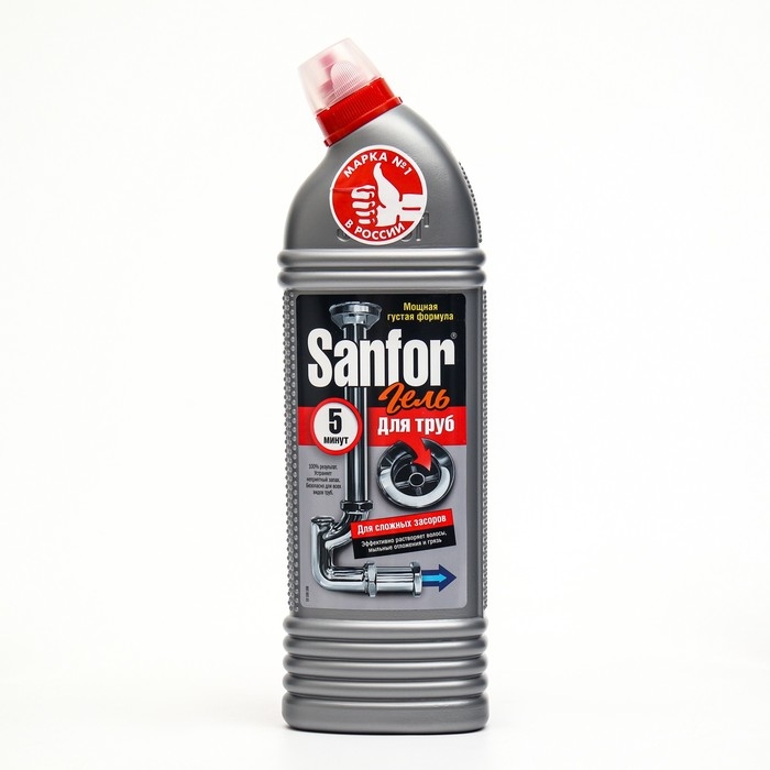 Средство для прочистки канализационных труб "Sanfor" , 1000 мл обладает мощной силой для быстрого устранения даже очень сильных засоров в канализационных стоках всего за 5 минут.