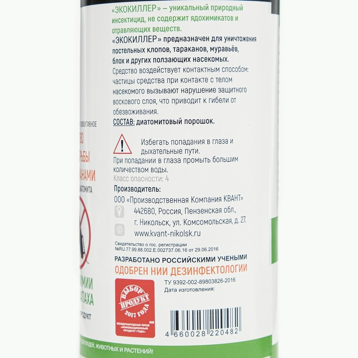 Уникальный биоинсектицид, не содержит ядохимикатов и отравляющих веществ. Полностью натуральное, экологичное средство. Безопасно для людей и животных.Не токсичен. Не имеет запаха. Не вызывает аллергических реакций и отравления.Принцип действия: микрочастицы средства (с порами и острыми кромками нанометрового размера) попадают на тело насекомого, суставы или сочленения. Восковый слой механически разрушается. Вода из организма насекомого начинает быстро испаряться. В итоге насекомое погибает от иссушения.Сферы использования: уничтожение насекомых-вредителей в домах, квартирах, в других производственных зданиях и сооружениях.Применение: средство необходимо рассыпать в местах, где были замечены вредители - у плинтуса, на полках с книгами, под кроватью, обработать каркас кровати. В течении суток не проводить уборку помещения. При необходимости повторить обработку. Состав: 100% диатомитовый порошок (кремний).