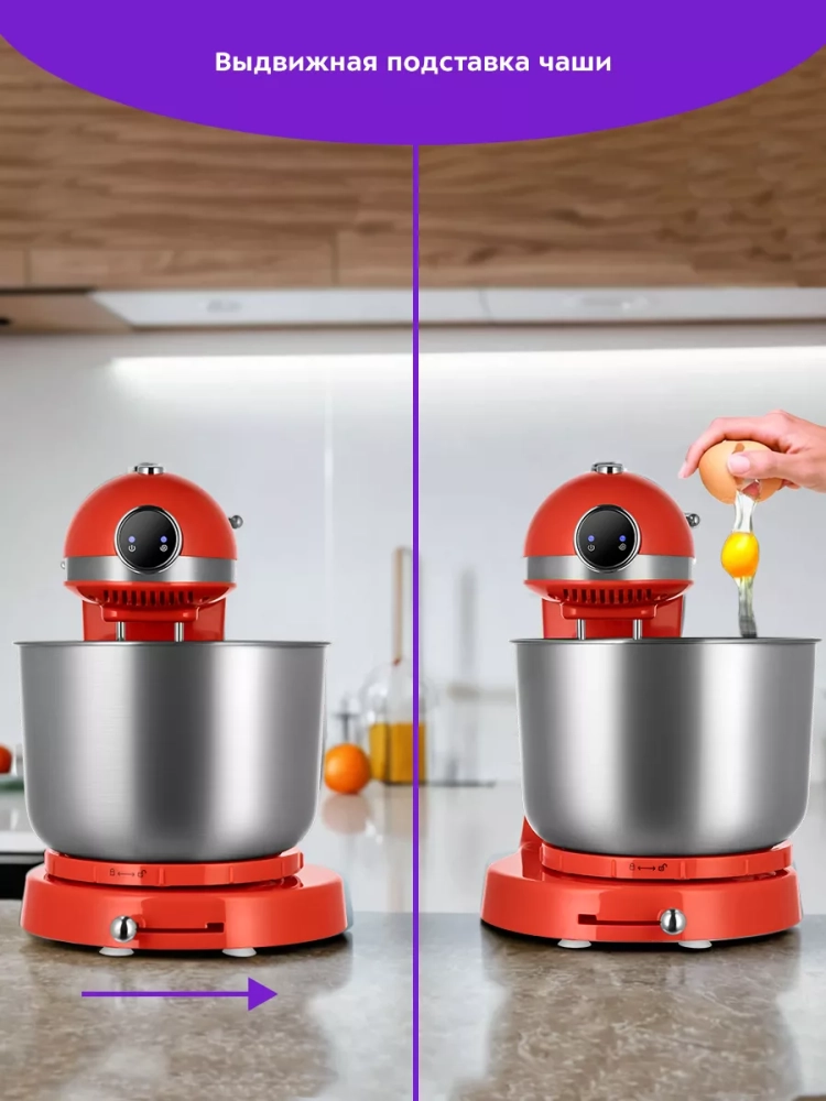 В комплекте с устройством поставляются два вида насадок: венчики подходят для взбивания ингредиентов и замешивания жидкого теста для блинов, вафель или бисквитов, а крюки — для замешивания более плотного теста, например, песочного или дрожжевого. Для снятия насадок достаточно одного нажатия на кнопку, поэтому их легко менять и мыть.
