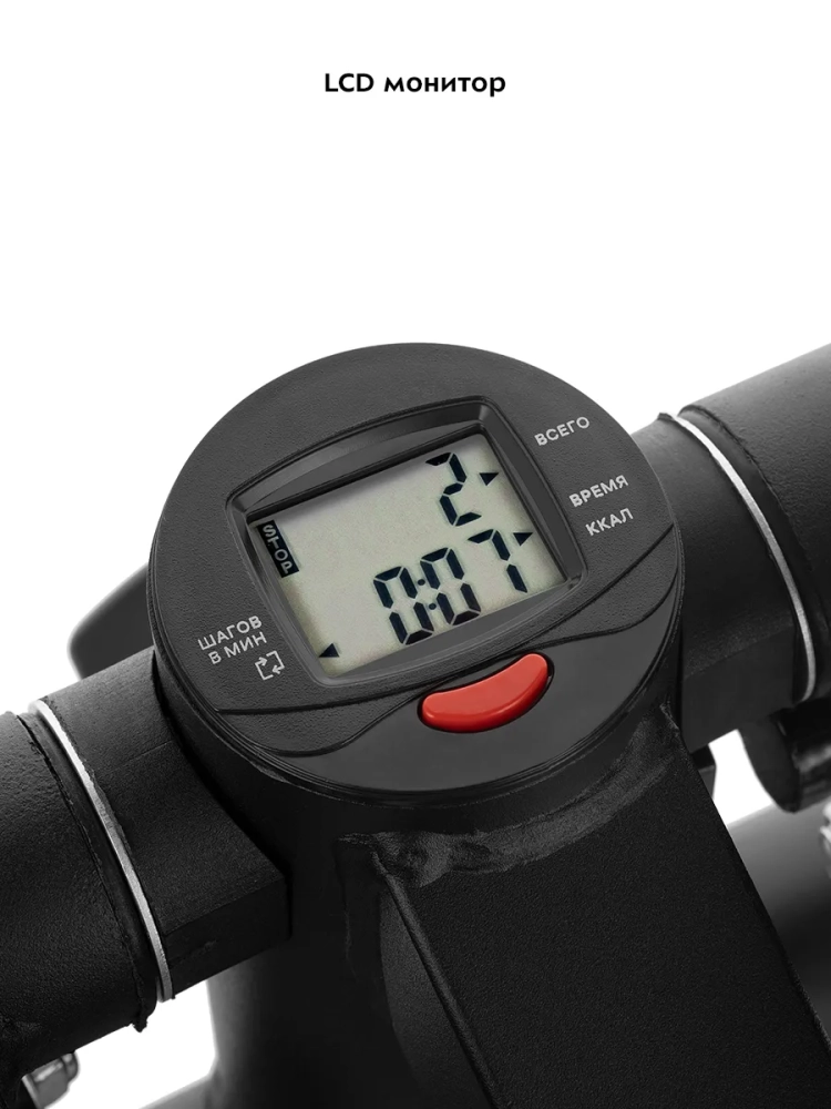 На дисплее монитора отображены параметры тренировки: длительность тренировки, количество нажатий на педали в минуту, суммарное количество нажатий на педали и количество сожженых калорий. Это позволит вам контролировать нагрузку во время тренировки и ее длительность согласно вашему желанию.