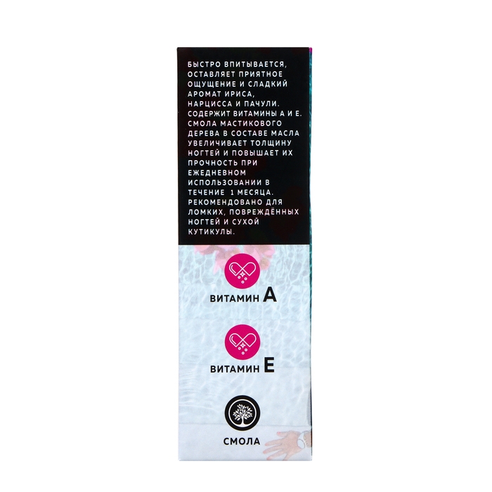 Быстро впитывается, оставляет приятное ощущение и сладкий аромат ириса, нарцисса и пачули. Содержит витамины А и Е. Смола мастикового дерева в составе масла увеличивает толщину ногтей и повышает их прочность при ежедневном использовании в течение 1 месяца. Рекомендовано для ломких, повреждённых ногтей и сухой кутикулы.