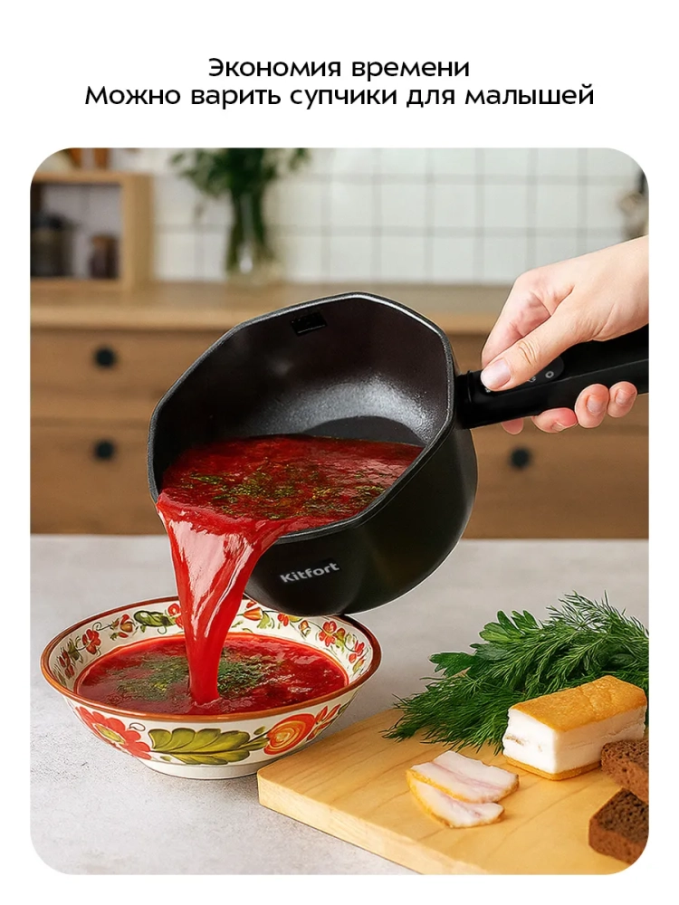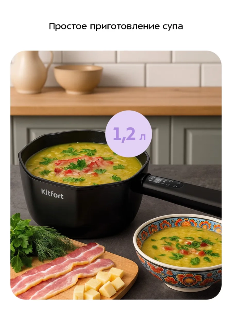 Суповарка электрическая КТ-224 от Kitfort — это незаменимый кухонный бытовой прибор, который станет вашим надежным помощником на кухне. Этот мощный электроагрегат с мощностью 800 Вт и емкостью 1,5 литра позволяет быстро и легко приготовить вкусные супы для всей семьи. Благодаря своей функциональности, суповарка идеально подходит для тех, кто ценит свое время и стремится к здоровому питанию. Электрокастрюля оснащена двойными стенками: наружная часть выполнена из прочного пластика, а внутренняя — из алюминия с антипригарным покрытием. Это позволяет не только варить супы без лишних хлопот по мытью посуды после готовки, но и жарить ингредиенты прямо в приборе. Удобная крышка обеспечивает герметичность во время приготовления. На ручке устройства расположена панель управления с шестью предустановленными режимами работы. Вы можете выбрать подходящий режим в зависимости от ваших предпочтений: от классического варки до поддержания тепла или парового режима. Таймер позволяет установить время приготовления в режимах «Пар» и «Поддержание тепла», что делает процесс готовки еще более комфортным. Эта электро техника станет отличным дополнением к вашему дому благодаря своей простоте использования и многофункциональности, а также съёмного поддона. Суповарка особенно пригодится мамам для быстрого приготовления детских блюд или тем, кто хочет экономить время на кухне. Суповарка имеет длину шнура 0,8 м и размеры 380 х 210 x 160 мм при напряжении ~220–240 В (50/60 Гц). Она относится к классу защиты I от поражения электрическим током.
