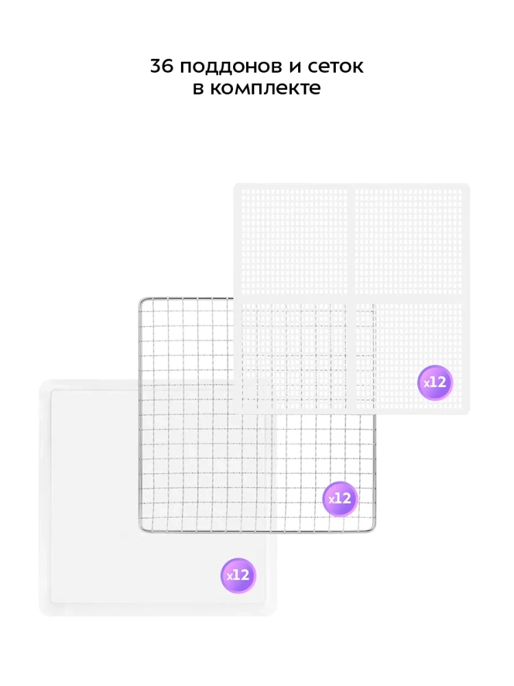 Сушилка имеет две независимые камеры, в каждую их которых может быть установлено по 6 металлических поддонов. В комплект также входят сетки для мелких продуктов и сплошные поддоны. В левой камере находится вращательный механизм с крючками, на которых можно сушить продукты в вертикальном виде.