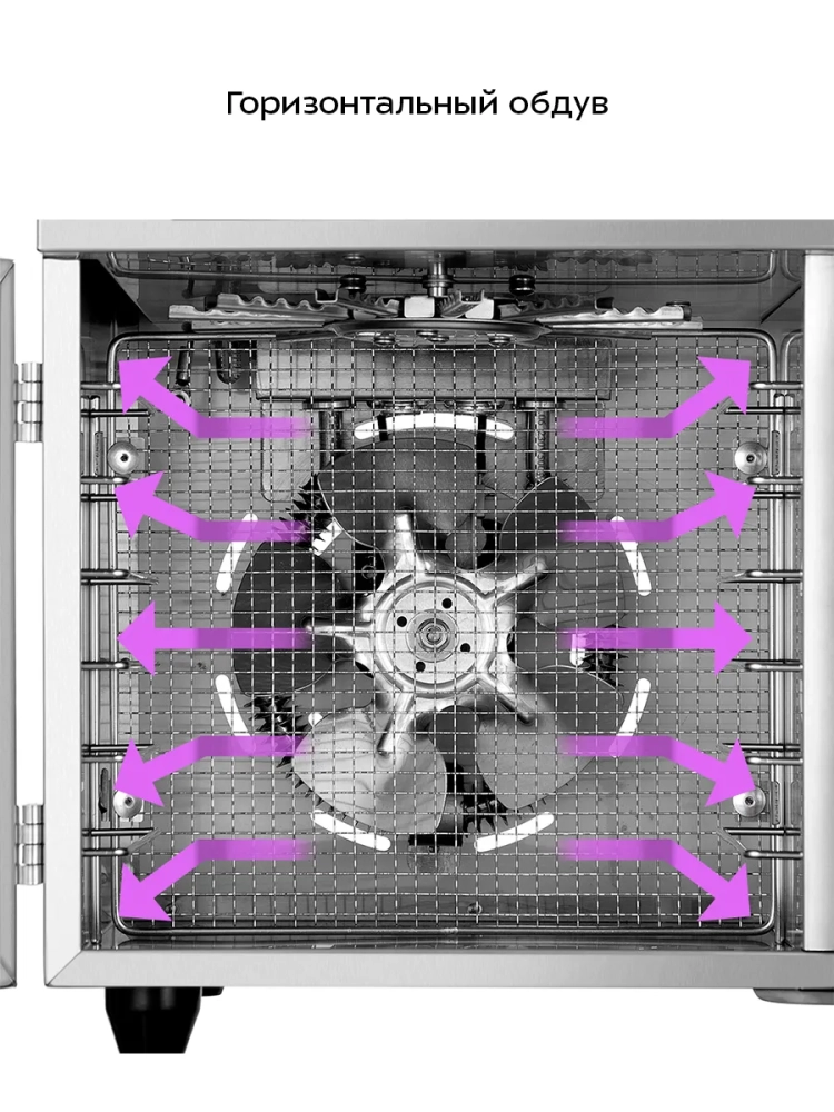 В сушилку установлены мощные нагревательные элементы и два вентилятора, обеспечивающих равномерное распределение нагретого воздуха по всему объему камер. Благодаря горизонтальному обдуву смешение запахов при одновременной сушке разных продуктов минимально.