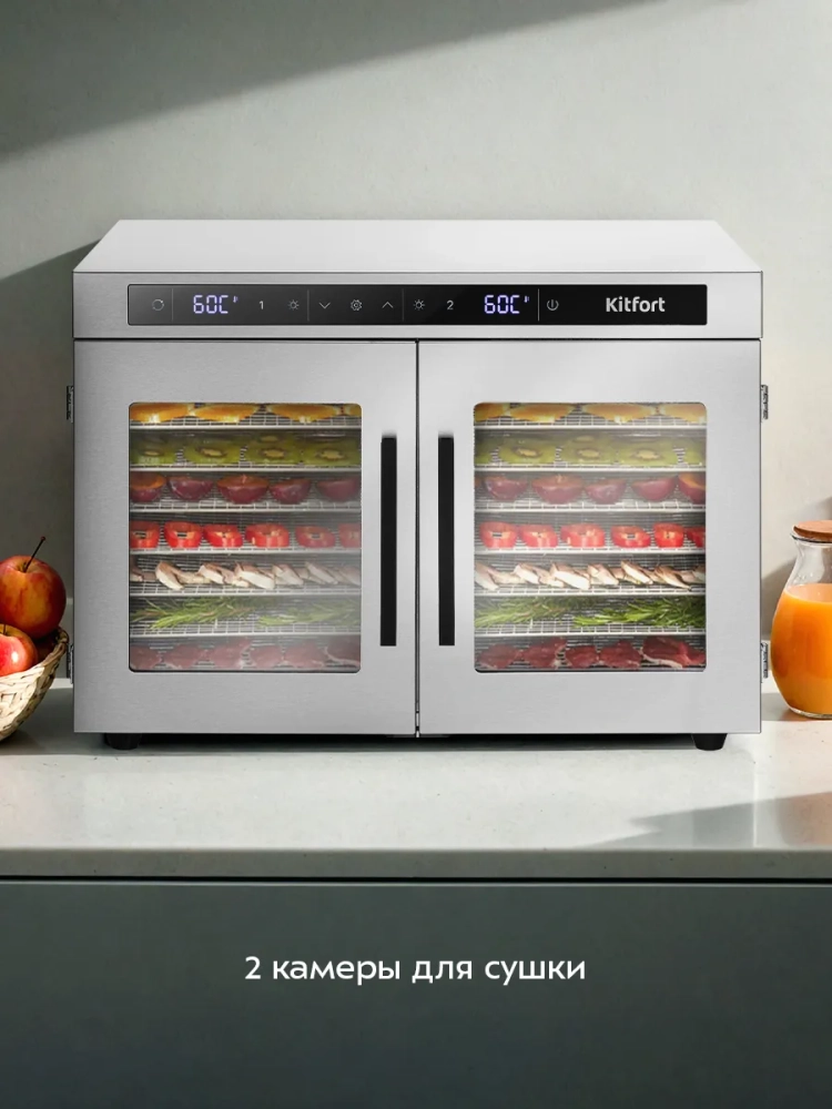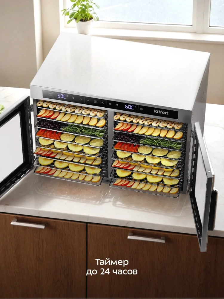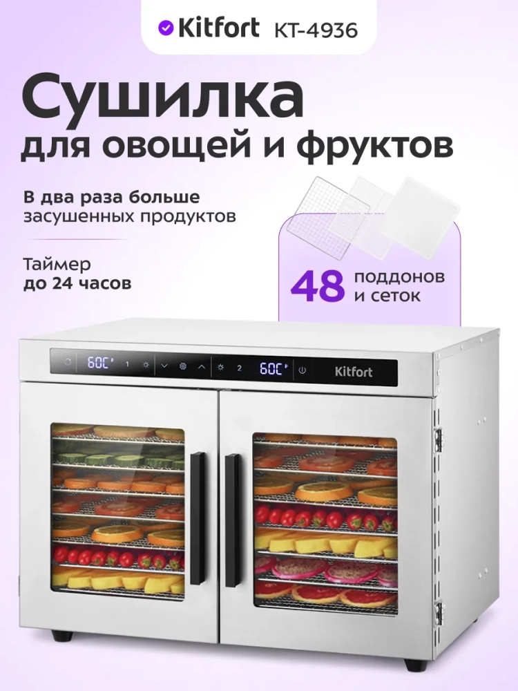 Электрическая сушилка Kitfort КТ-4936 предназначена для сушки овощей, фруктов, ягод, грибов, корнеплодов, трав и зелени, а также мяса и рыбы, хлеба.