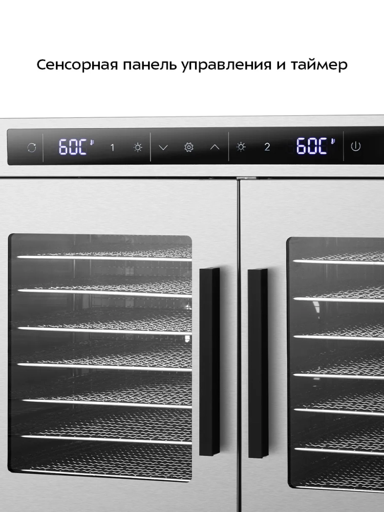 Температуру сушки можно изменить от 30 до 70 °С с шагом 1 °С. Сушилка оснащена таймером до 24 часов работы.