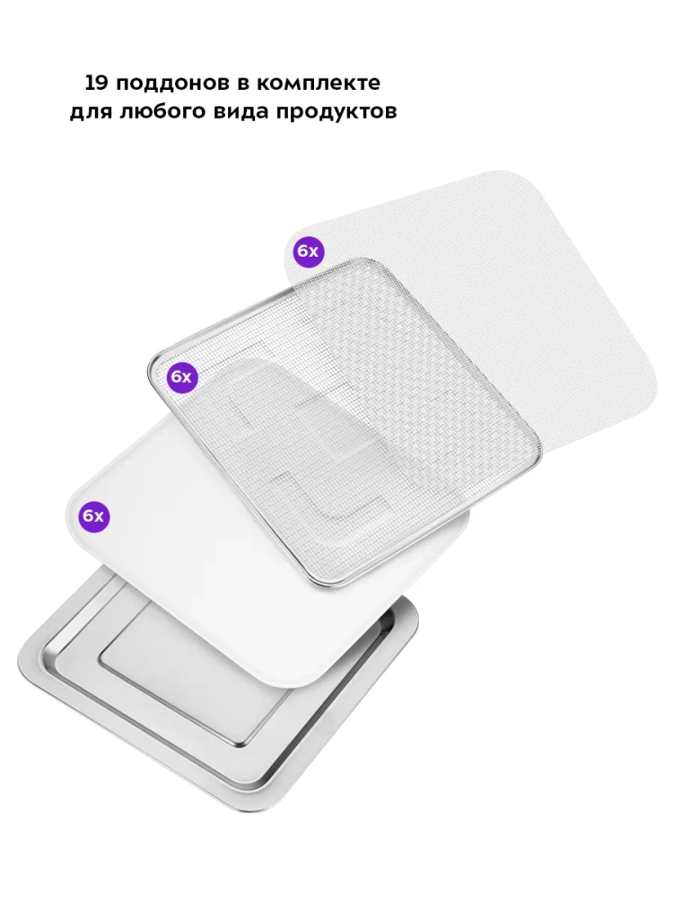 Сушилка имеет в комплекте 6 металлических поддонов, 6 сеток для мелких продуктов и 6 силиконовых сплошных поддонов. Также в комплект входит 1 поддон для жидкости, который облегчает очистку устройства: на поддон попадают остатки от продуктов и сок, после чего поддон легко достать и очистить, а дно камеры сушилки остается чистым.