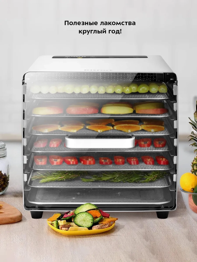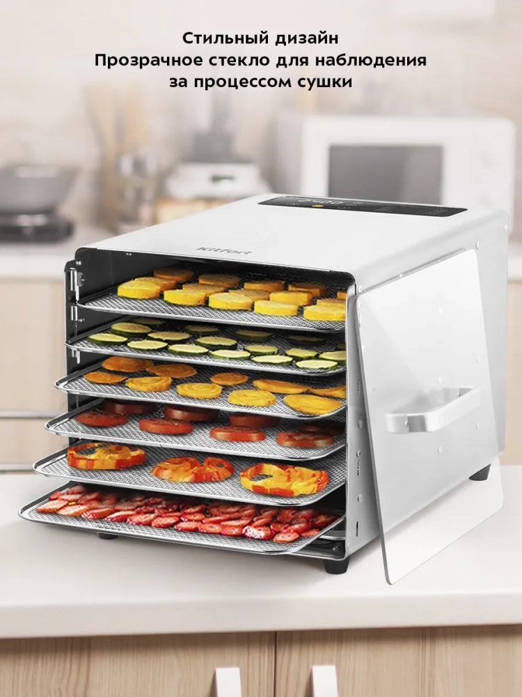 Электрическая сушилка Kitfort КТ-4904 предназначена для сушки овощей, фруктов, ягод, грибов, корнеплодов, трав и зелени, а также мяса и рыбы, хлеба.