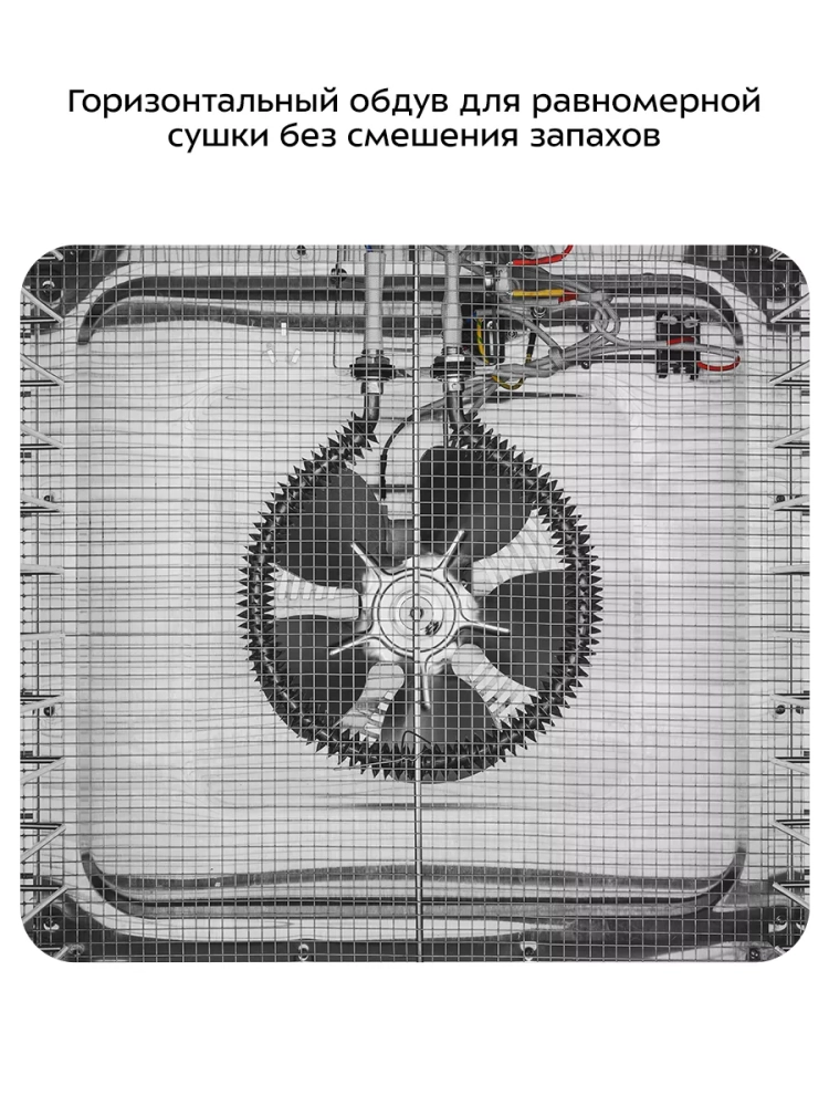 В сушилку установлен мощный нагревательный элемент и вентилятор, обеспечивающий равномерное распределение нагретого воздуха по всему объему камеры. Благодаря горизонтальному обдуву смешение запахов при одновременной сушке разных продуктов минимально.