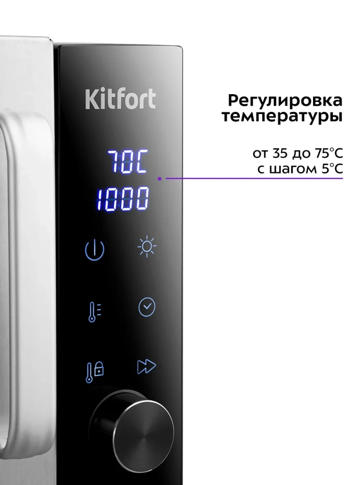 Температуру сушки можно изменить от 35 до 75 °С с шагом 5 °С. Сушилка оснащена таймером работы от 30 минут до 24 часов с шагом 30 минут.