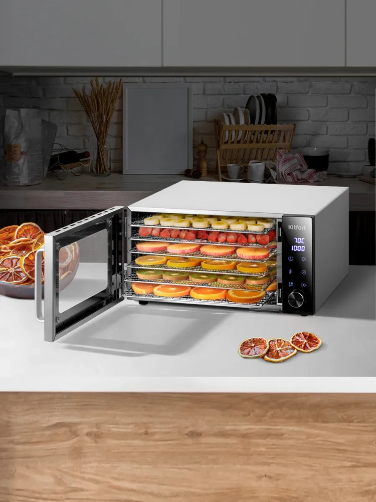 Электрическая сушилка Kitfort КТ-4938 предназначена для сушки овощей, фруктов, ягод, грибов, корнеплодов, трав и зелени, а также мяса и рыбы, хлеба.