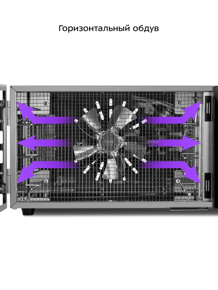 В сушилку установлен мощный нагревательный элемент и вентилятор, обеспечивающий равномерное распределение нагретого воздуха по всему объему камеры. Благодаря горизонтальному обдуву смешение запахов при одновременной сушке разных продуктов минимально.