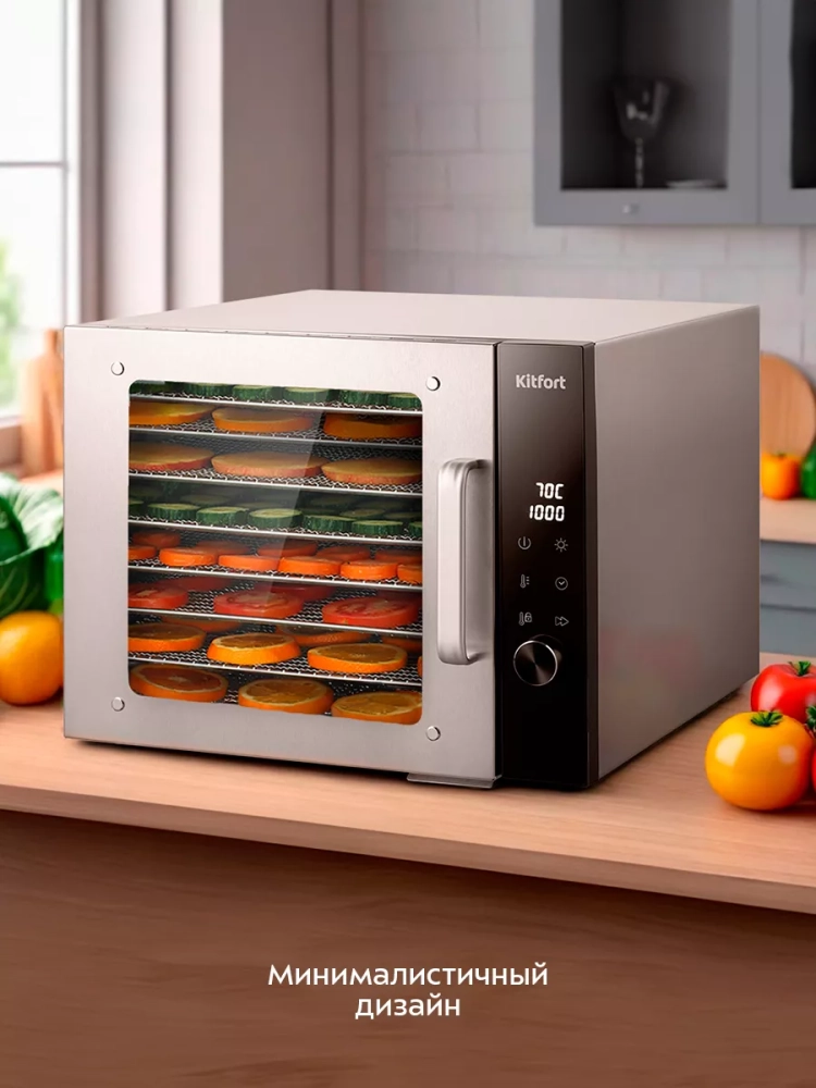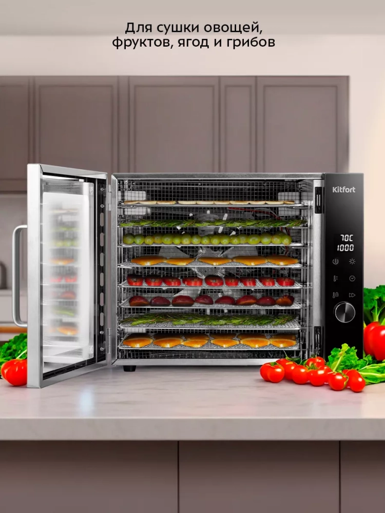 Электрическая сушилка Kitfort КТ-4939 предназначена для сушки овощей, фруктов, ягод, грибов, корнеплодов, трав и зелени, а также мяса и рыбы, хлеба.