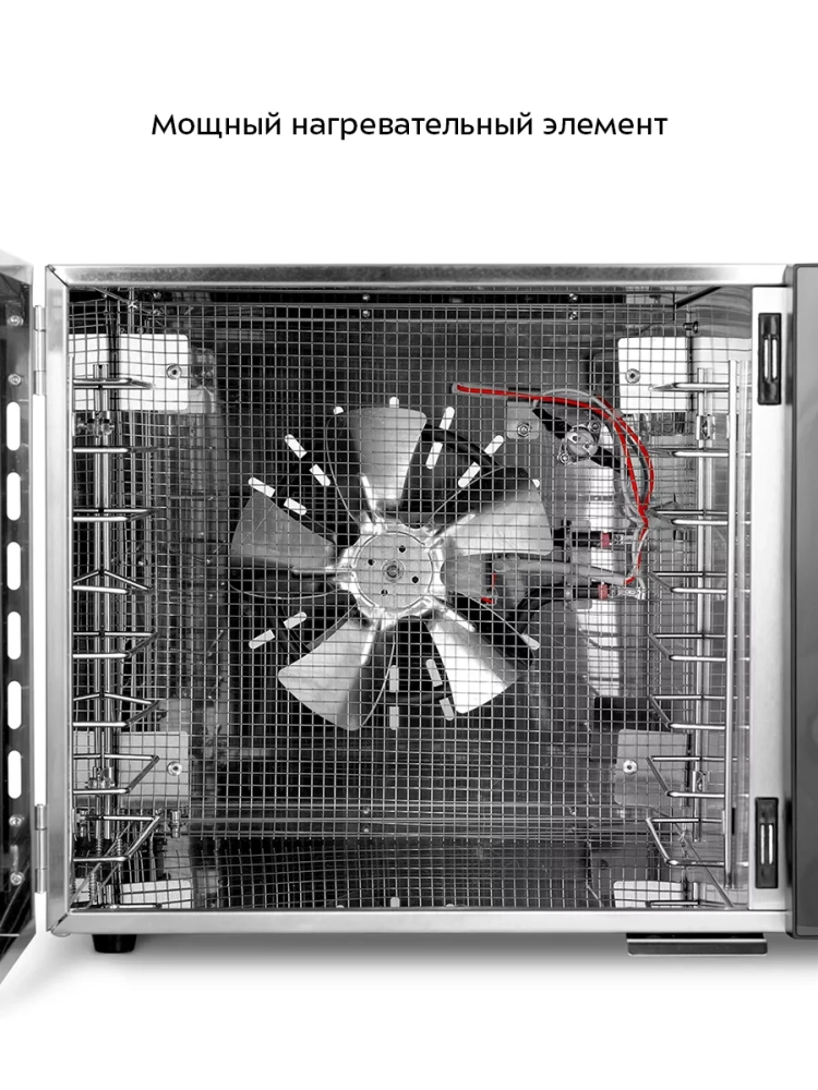 В сушилку установлен мощный нагревательный элемент и вентилятор, обеспечивающий равномерное распределение нагретого воздуха по всему объему камеры. Благодаря горизонтальному обдуву смешение запахов при одновременной сушке разных продуктов минимально.