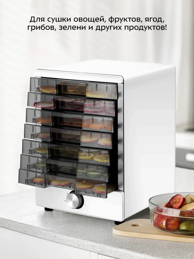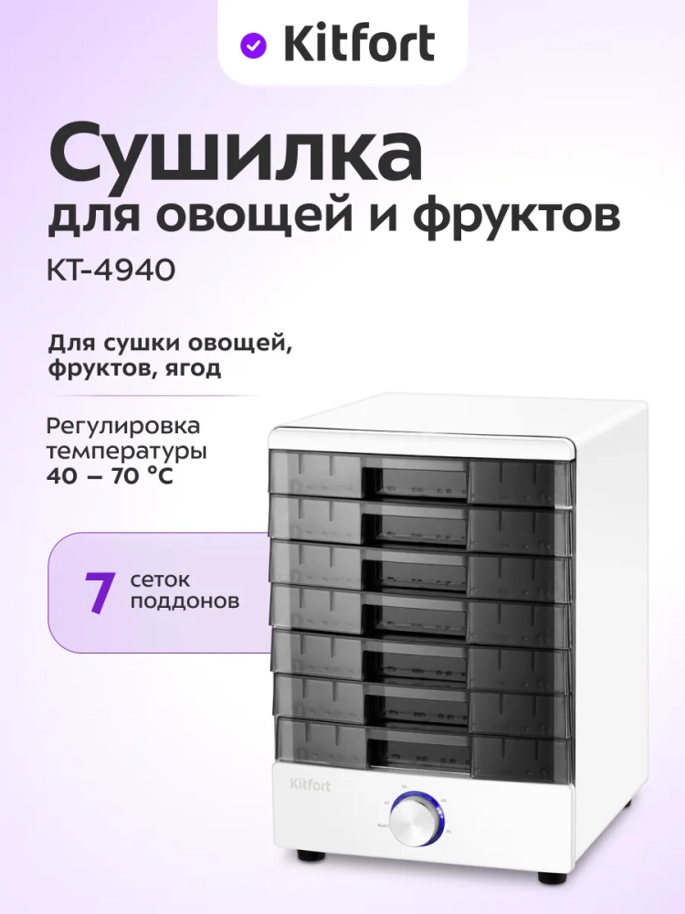 Электрическая сушилка Kitfort KT-4940 предназначена для сушки овощей, фруктов, ягод, грибов, корнеплодов, трав и зелени, а также хлеба.