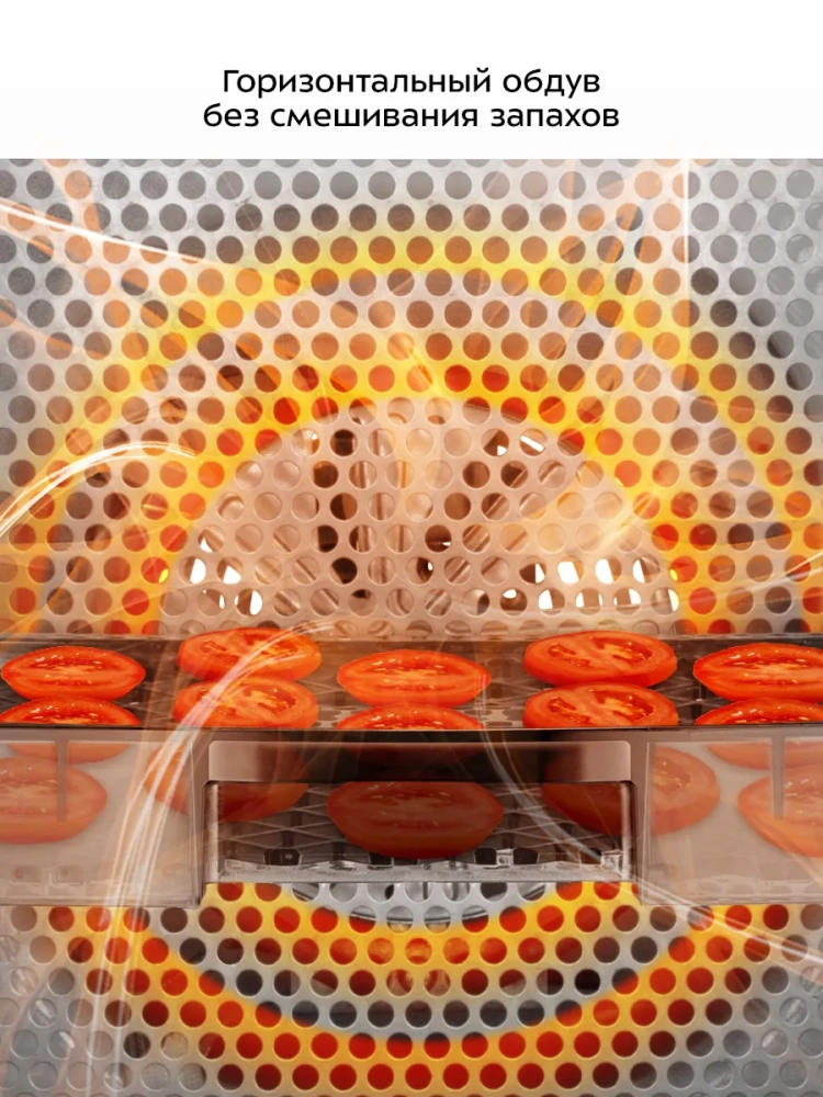 В сушилке установлен нагревательный элемент, а также вентилятор, обеспечивающий равномерное распределение нагретого воздуха по всему объему камеры. Благодаря горизонтальному обдуву смешение запахов при одновременной сушке разных продуктов минимально.