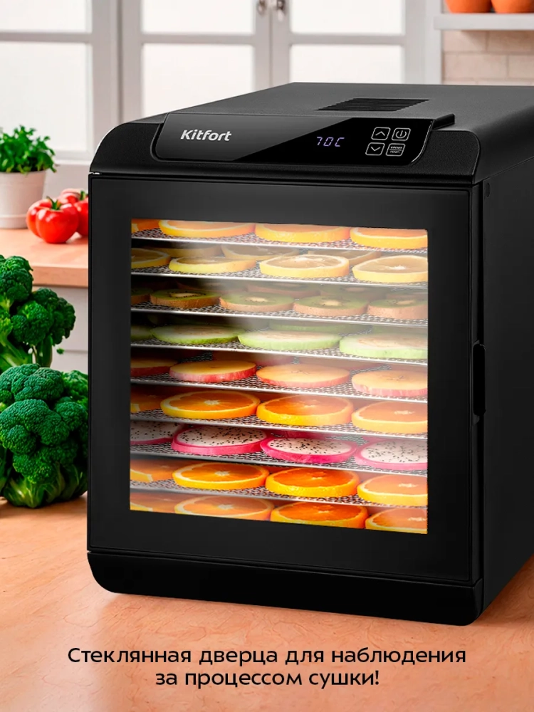 Электрическая сушилка для овощей и фруктов Kitfort КТ-4949 — это надежная бытовая техника, предназначенная для эффективной сушки различных продуктов. Кухонный прибор идеально подходит для обработки овощей, фруктов, ягод, грибов и даже мяса. Благодаря встроенному нагревательному элементу и вентилятору обеспечивается равномерное распределение горячего воздуха по всей камере гаджета. Это позволяет минимизировать смешение запахов при одновременной сушке разных продуктов. Сушилка оснащена 10 металлическими поддонами, 10 сплошными пластиковыми поддонами и 10 сетками. Размеры металлического поддона составляют 305 × 332 мм, а пластикового — 288 × 326 мм. Сетка имеет размеры 305 × 330 мм. Расстояние между поддонами составляет всего лишь 29 мм. Температура сушки регулируется в диапазоне от 35 до 70 °С с шагом в пять градусов Цельсия, что позволяет точно настроить процесс дегидрации в зависимости от типа продукта: будь то ягода или мясо. Таймер можно установить на период от получаса до почти двадцати часов (19,5 ч) с шагом в полчаса. Эта электросушилка работает при напряжении ~220–240 В и частоте тока в диапазоне от пятидесяти до шестидесяти герц (50/60 Гц). Мощность устройства варьируется между шестьюстами и семьюстами ватт (600–700 Вт), что делает его энергоэффективным выбором для домашнего использования. Kitfort КТ-4949 — это не просто дигидратор; это универсальный дегидратор для создания пастилы из фруктов или овощей дома! Овощесушилка также подходит для приготовления вкусных закусок из мяса или рыбы без добавления консервантов.