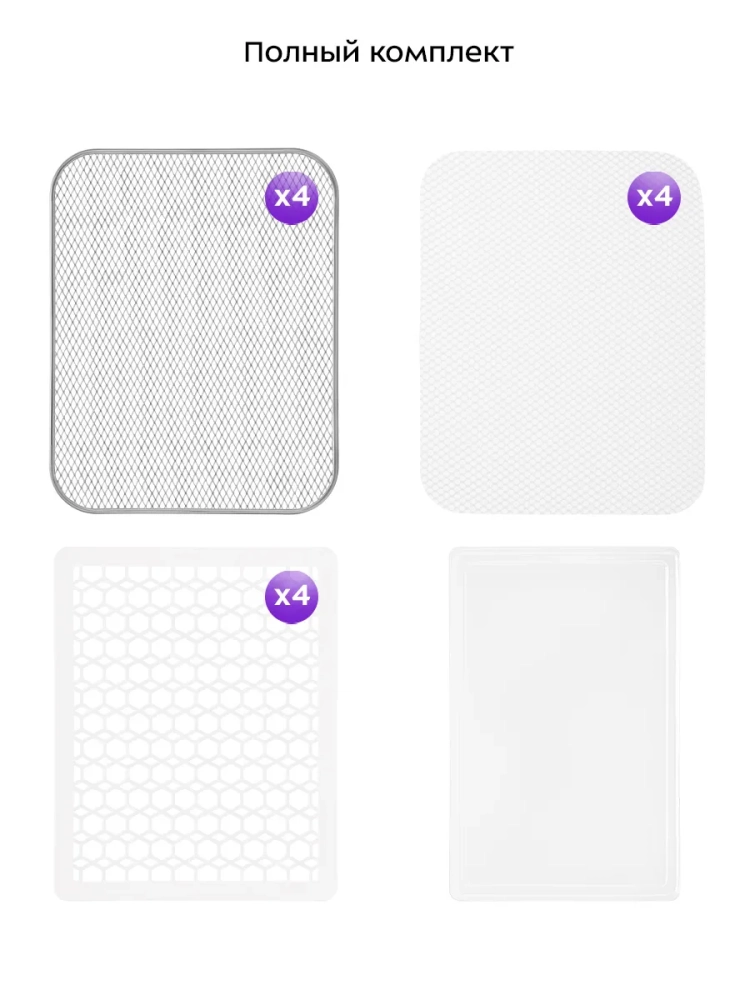 В комплект сушилки входят 4 металлических поддона, 4 пластиковых поддона, 4 сплошных пластиковых поддона и 4 сетки для сушки мелких продуктов.