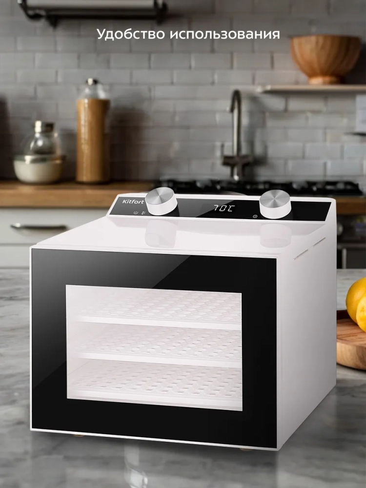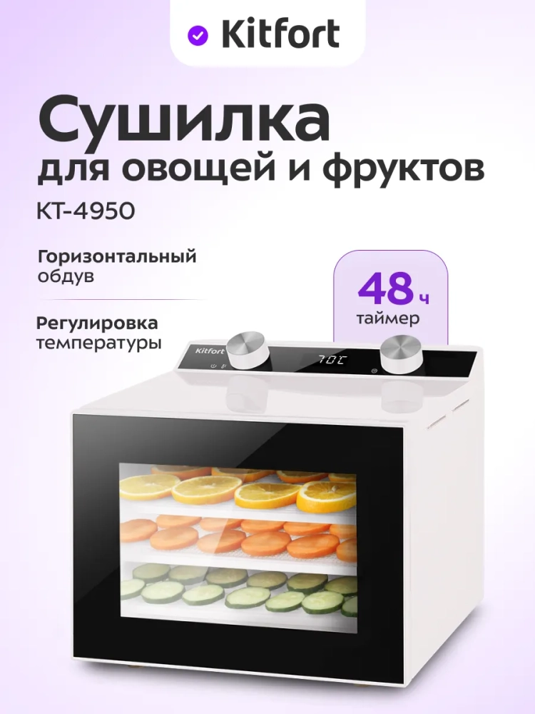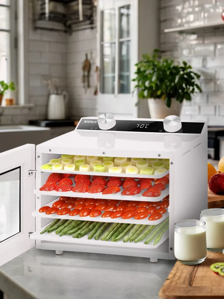 Электрическая сушилка Kitfort KT-4950 предназначена для сушки овощей, фруктов, ягод, грибов, корнеплодов, трав и зелени, а также мяса и рыбы, хлеба.