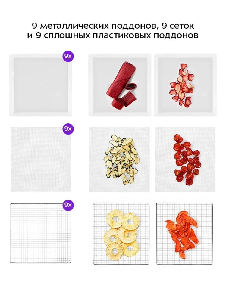 Сушилка имеет в комплекте 9 металлических поддонов, 9 сплошных поддонов и 9 сеток.