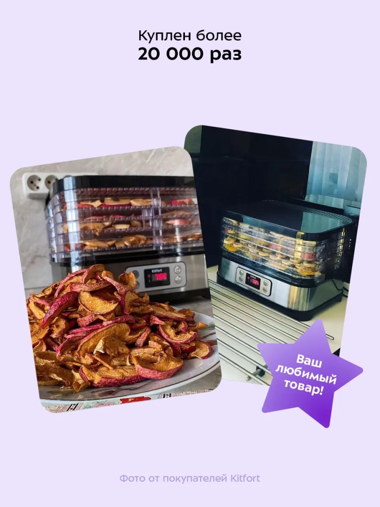 Дегидратор Kitfort — это не просто бытовая техника, а незаменимый инструмент для тех, кто любит готовить и заботится о здоровье. Сушилки для овощей и фруктов позволяют сохранить натуральный вкус и питательные вещества продуктов. Используйте эту кухонную технику для сушки рыбы, мяса и других продуктов, чтобы наслаждаться их вкусом в любое время года.