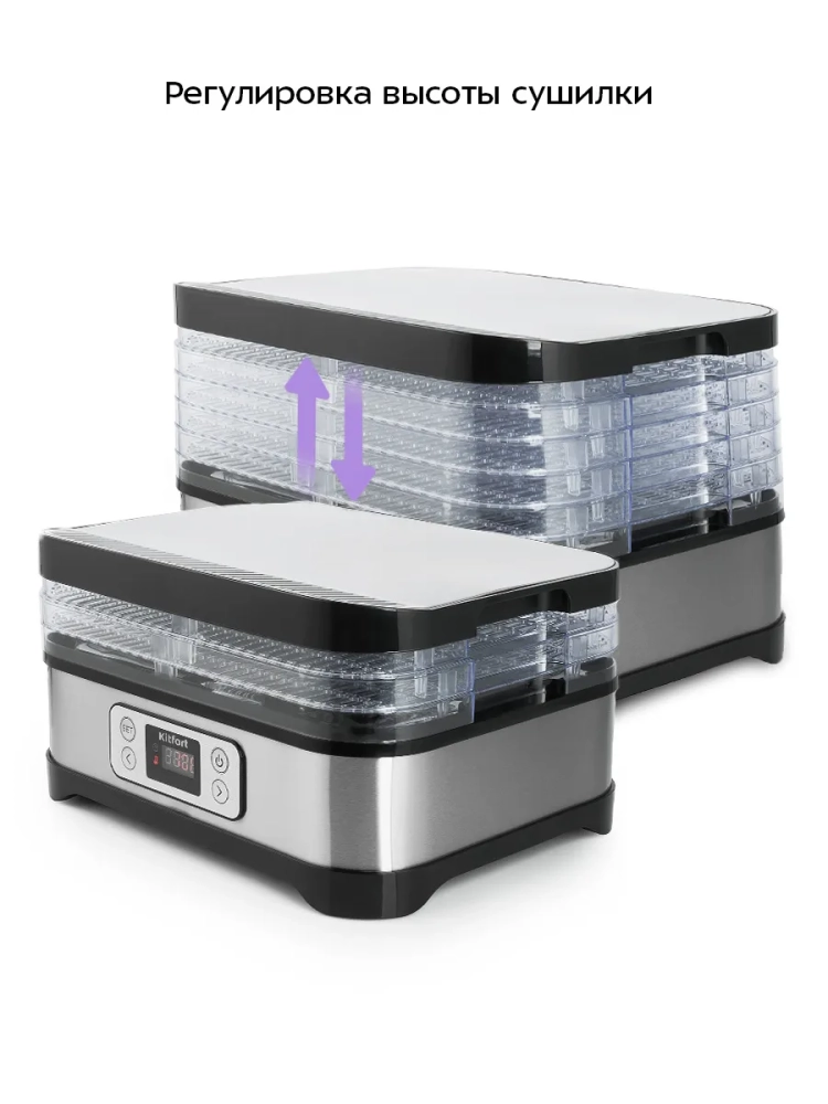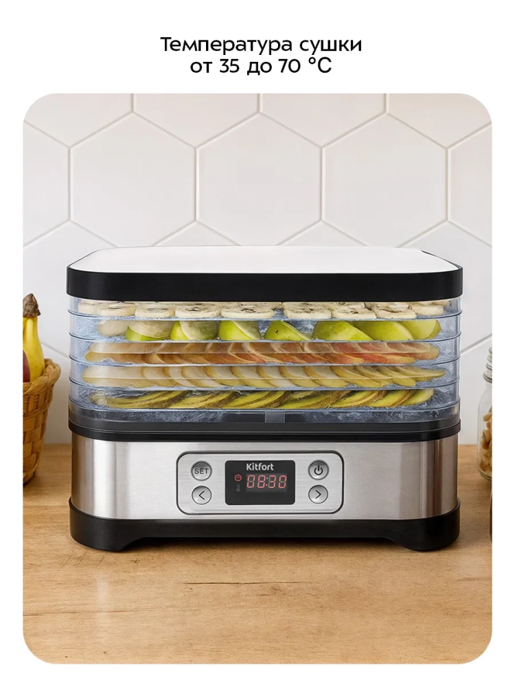 Сушилка для овощей и фруктов обладает устойчивыми ножками, что гарантирует стабильность во время работы. Мотор устройства обеспечивает тихую и эффективную работу, а электроника контролирует процесс сушки, предотвращая перегрев. Дегидратор Kitfort — это идеальное решение для тех, кто ценит качество и надежность.