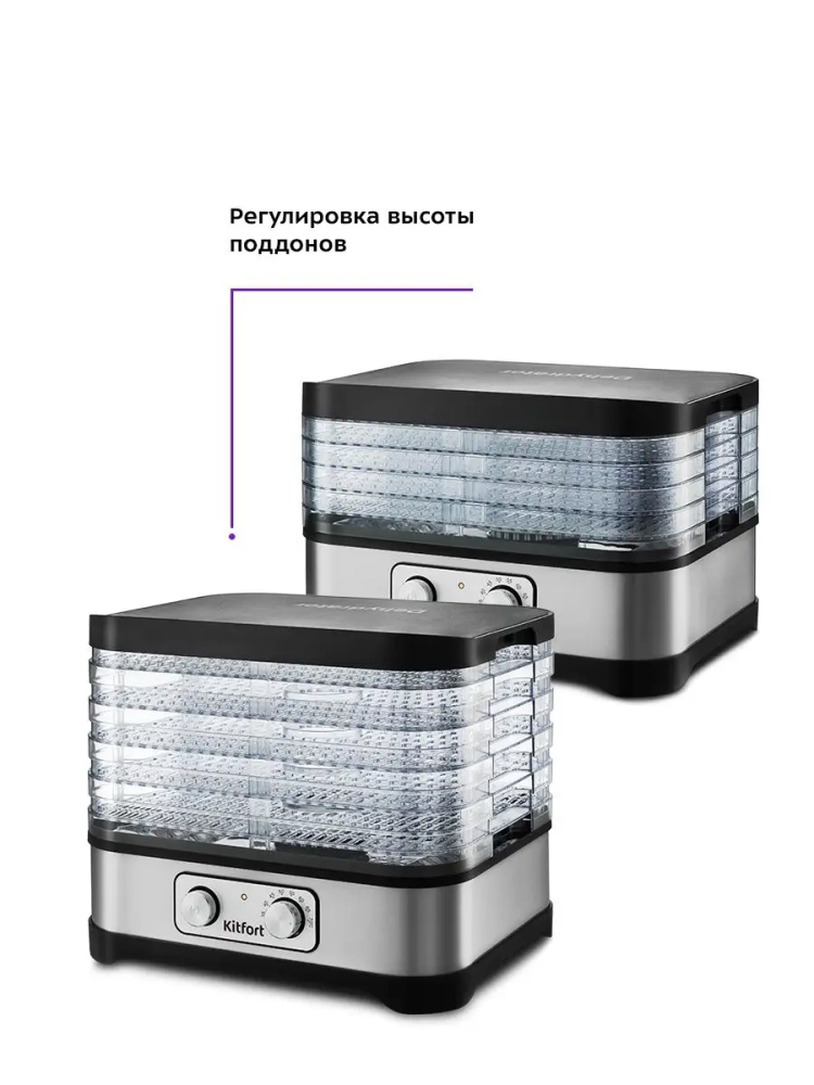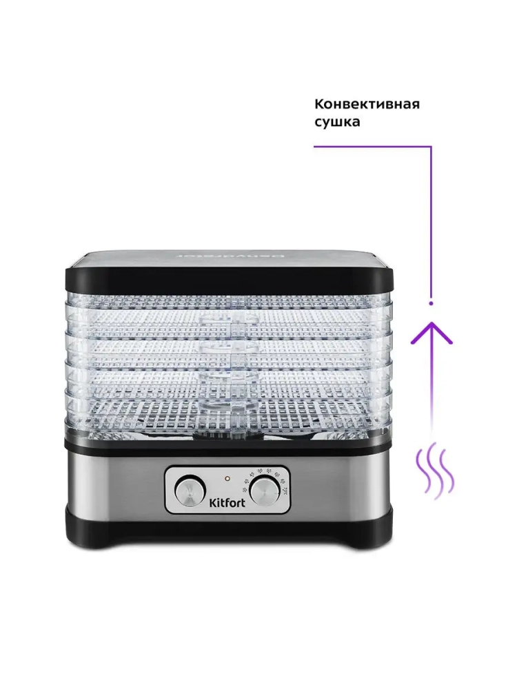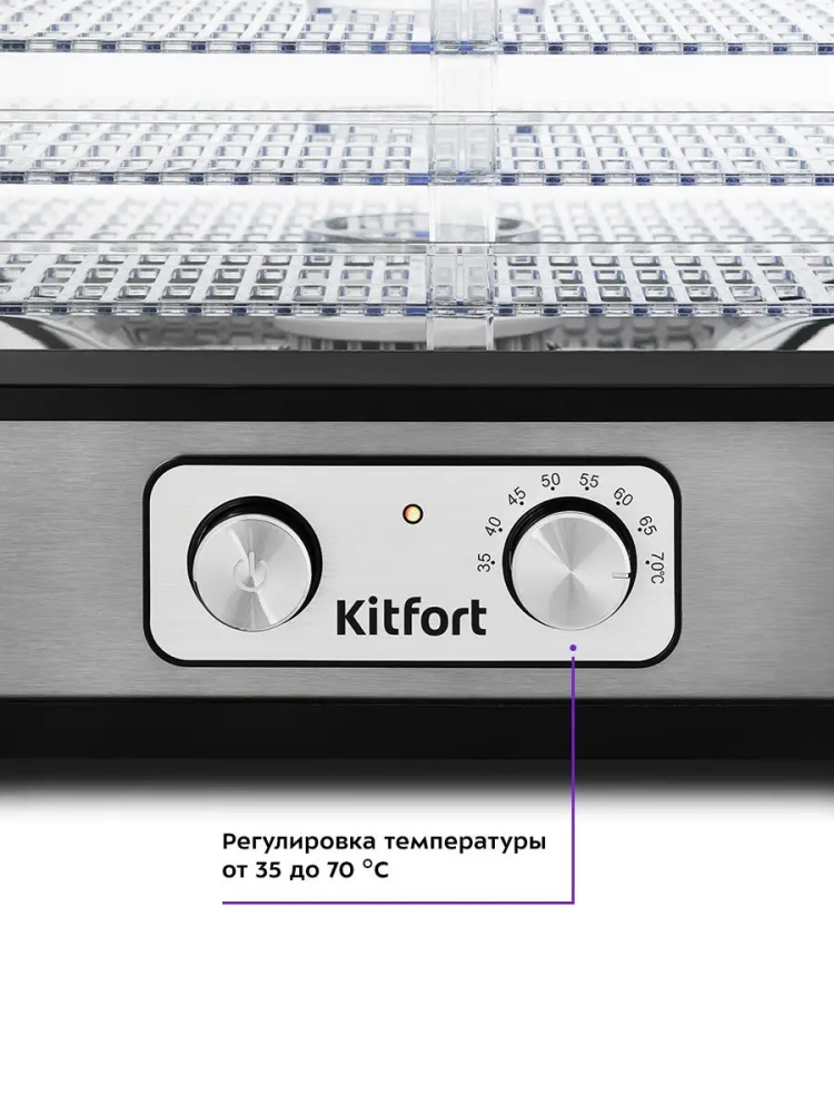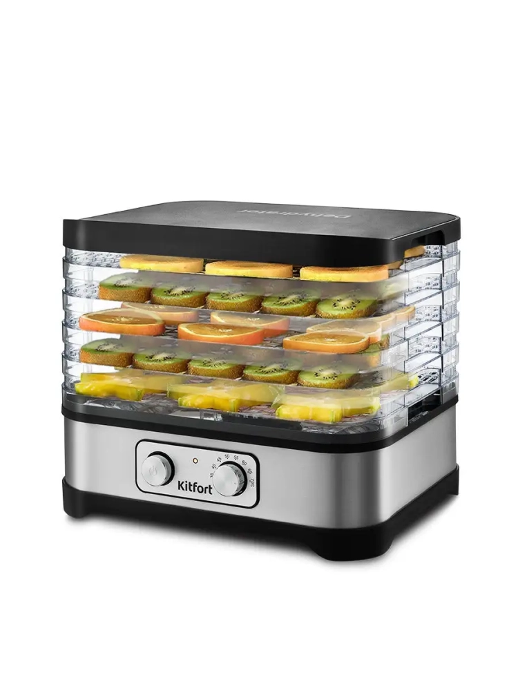 Электрическая сушилка Kitfort КТ-1912 предназначена для сушки овощей, фруктов, ягод, грибов, корнеплодов, трав и зелени, а также мяса и рыбы, хлеба. Сушилка имеет в комплекте 5 поддонов из прозрачного пластика, поэтому вы легко можете наблюдать за процессом сушки. В сушилке установлен мощный нагревательный элемент и вентилятор, обеспечивающий равномерное распределение нагретого воздуха по всему объему камеры. Сушилка может работать до 72 часов подряд. На передней панели есть регулятор, с помощью которого вы можете установить температуру в диапазоне 35-70 *С.