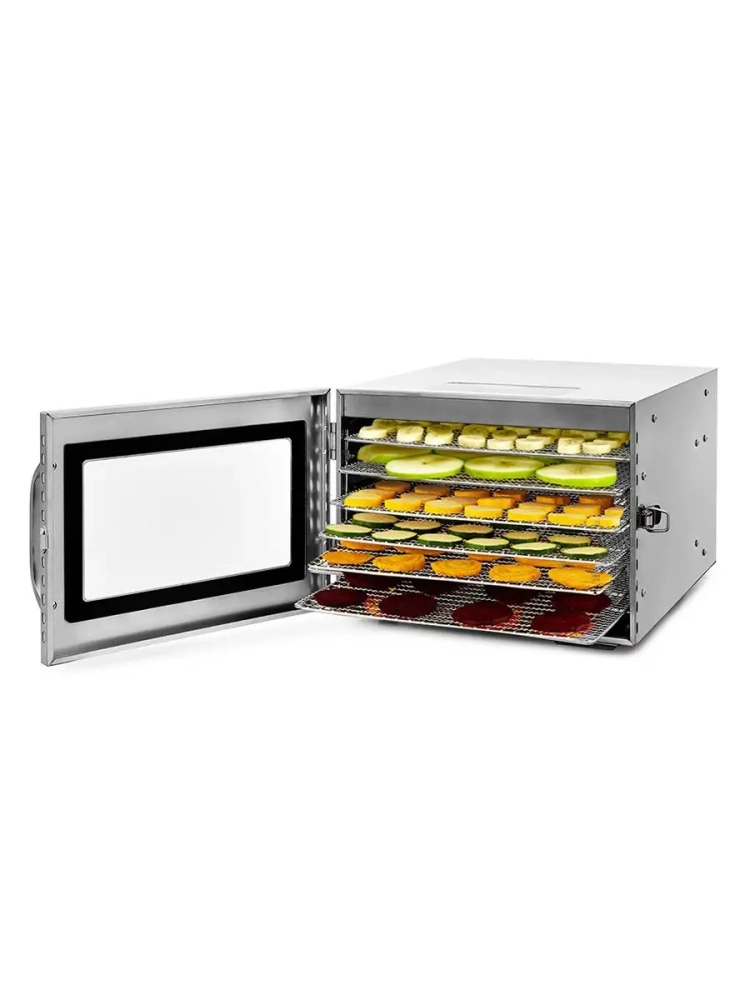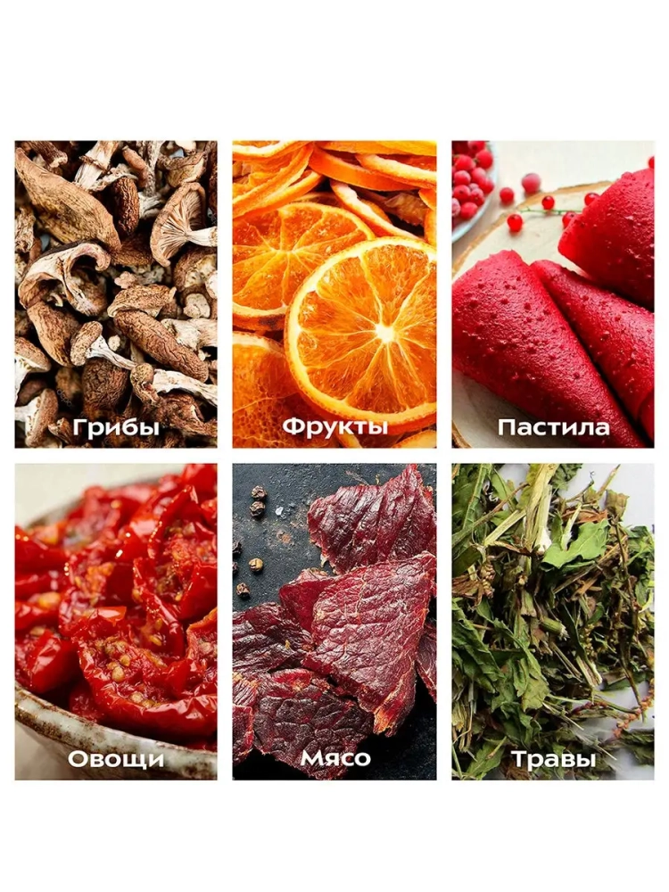 Электрическая сушилка Kitfort КТ-1917 предназначена для сушки овощей, фруктов, ягод, грибов, корнеплодов, трав и зелени, а также мяса и рыбы, хлеба. Сушилка имеет в комплекте 6 поддонов для сушки и 1 поддон для жидкости. Поддоны выполнены из нержавеющей стали. В сушилке установлен мощный нагревательный элемент и вентилятор большого диаметра, обеспечивающий равномерное распределение нагретого воздуха по всему объему камеры. Благодаря горизонтальному обдуву смешение запахов при сушке одновременно разных продуктов минимально. На сушилке можно установить температуру сушки в диапазоне 35-90 *С с шагом 5 градусов. Сушилка оснащена таймером до 24 часов работы с шагом 30 минут.