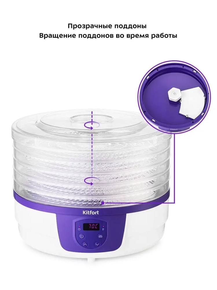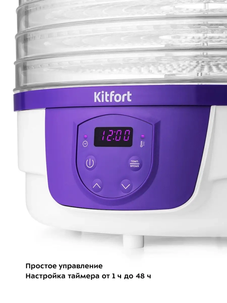 Электрическая сушилка для овощей и фруктов Kitfort КТ-1929 предназначена для сушки овощей, фруктов, ягод, грибов, корнеплодов, трав и зелени, а также хлеба. Сушилка имеет в комплекте 5 поддонов из прозрачного пластика, поэтому вы легко можете наблюдать за процессом сушки. Поддоны изготовлены из пластика, безопасного для здоровья — он не содержит Бисфенол А (BPA-free). В сушилке установлен мощный нагревательный элемент и вентилятор, а также вал, благодаря которому поддоны вращаются вокруг своей оси, что обеспечивает равномерное распределение нагретого воздуха по всему объему камеры. При помощи кнопок на панели управления вы можете установить температуру в диапазоне 40–70 *С с шагом 5 градусов и время в диапазоне от 1 часа до 48 часов с шагом 1 час.