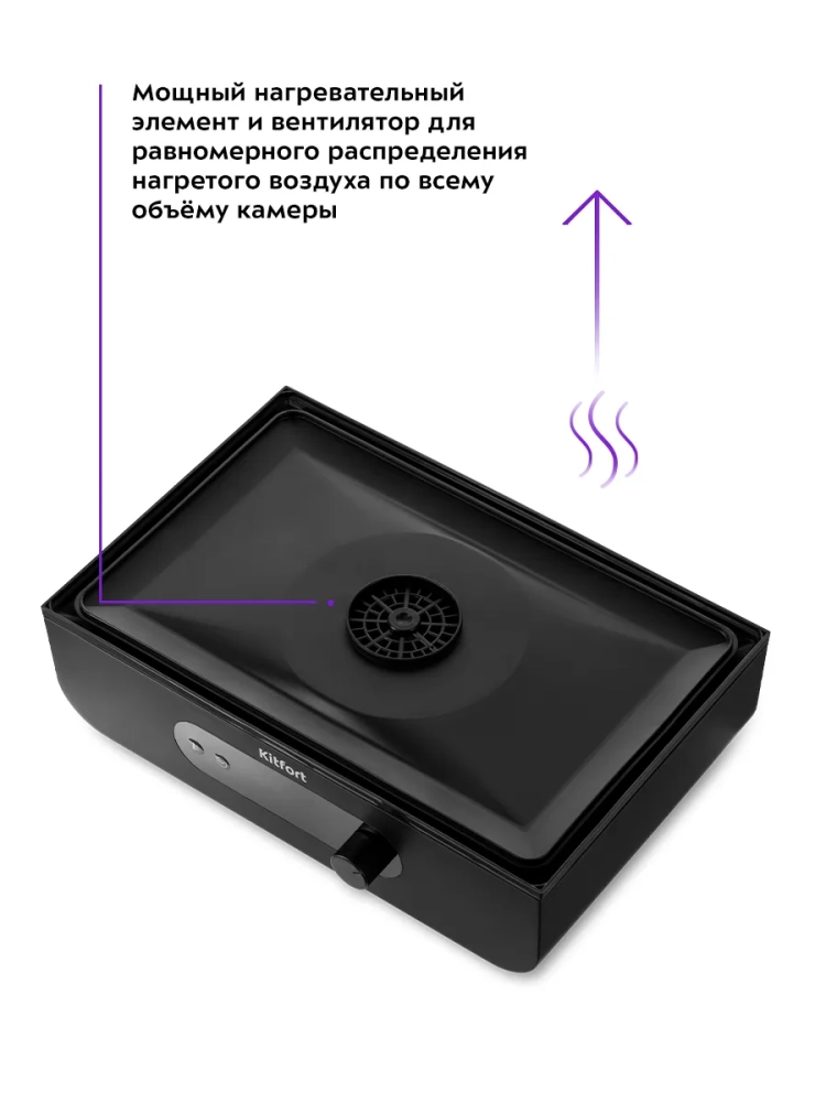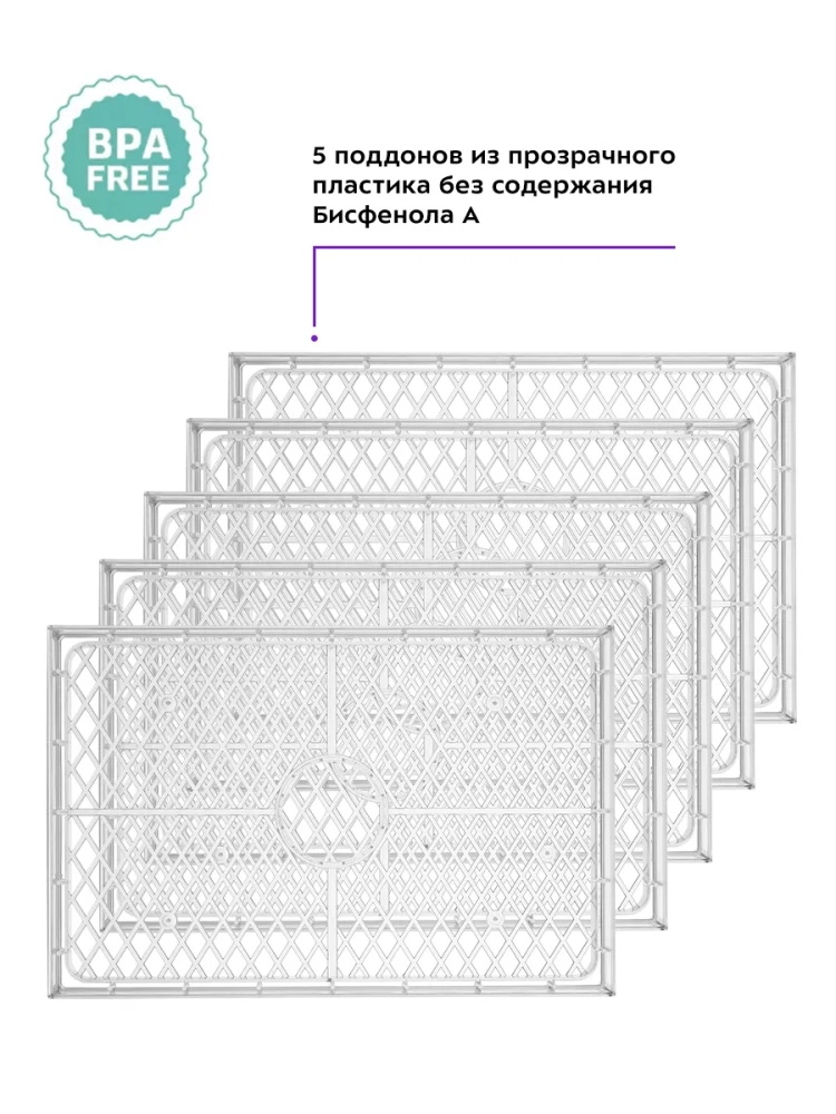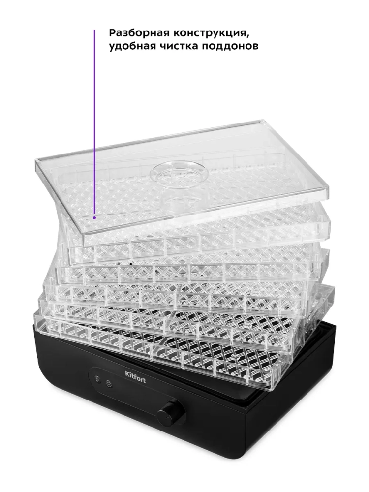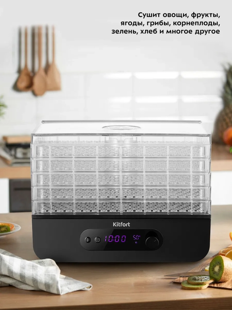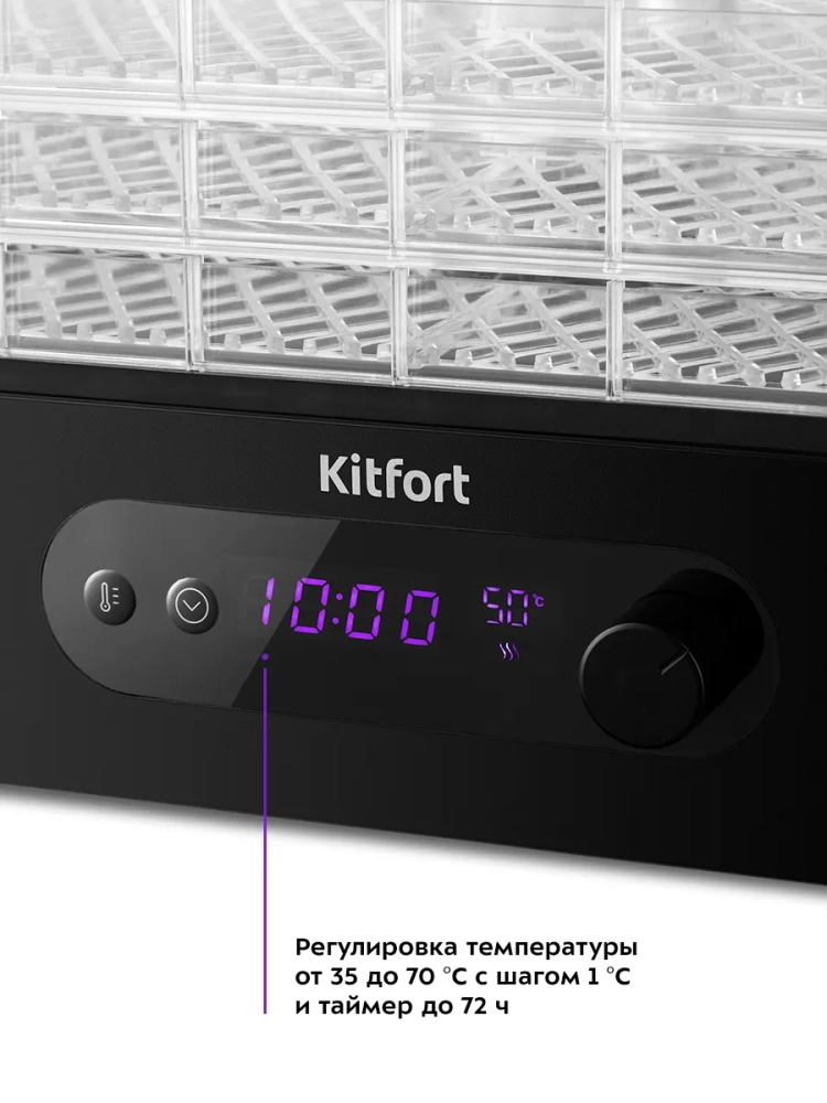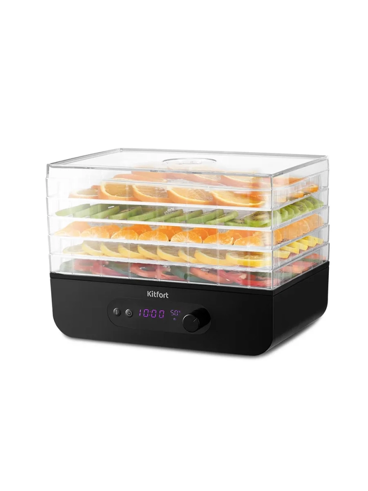 Электрическая сушилка для овощей и фруктов Kitfort КТ-1936 предназначена для сушки овощей, фруктов, ягод, грибов, корнеплодов, трав и зелени, а также хлеба. Сушилка имеет в комплекте 5 поддонов из прозрачного пластика, поэтому вы легко можете наблюдать за процессом сушки. Пластик поддонов - BPA-free, он не содержит Бисфенол А, тем самым данный вид пластика безопасен для здоровья. В сушилке установлен мощный нагревательный элемент и вентилятор, обеспечивающий равномерное распределение нагретого воздуха по всему объему камеры. На передней панели есть регулятор, с помощью которого вы можете установить температуру в диапазоне 35-70 *С с шагом 1 градус и время в диапазоне от 10 минут до 1 часа с шагом 10 мин и от 1 часа до 72 часов работы с шагом 1 час.
