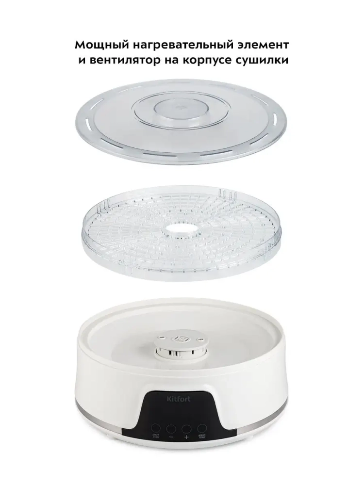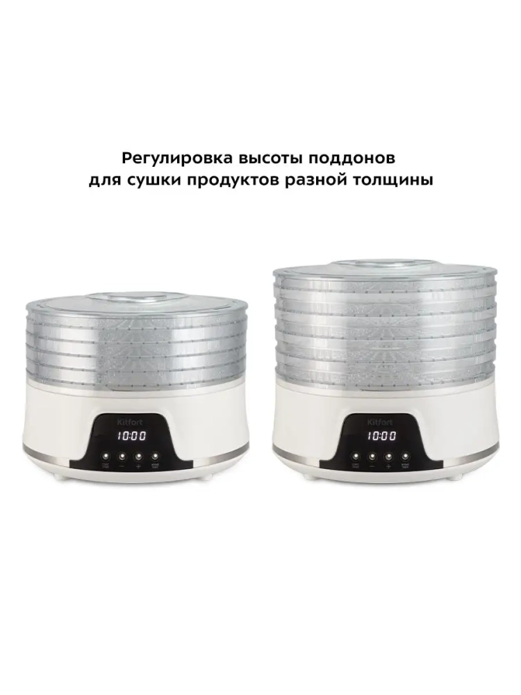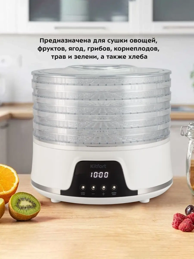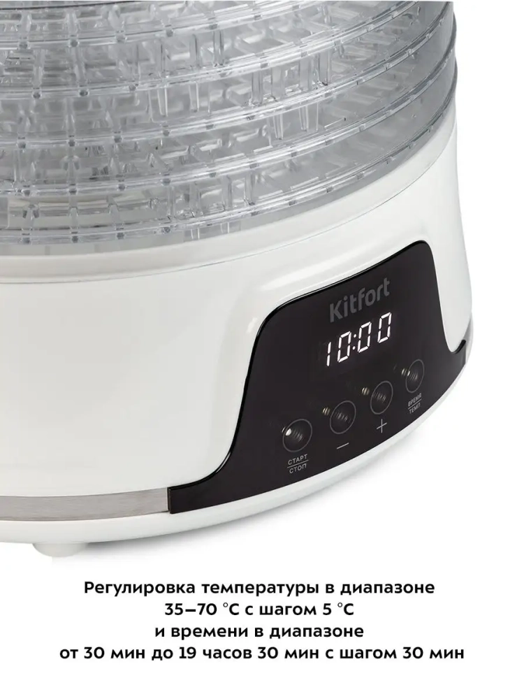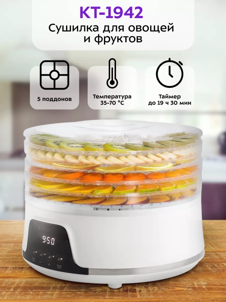 Электрическая сушилка для овощей и фруктов Kitfort КТ-1942 предназначена для сушки овощей, фруктов, ягод, грибов, корнеплодов, трав и зелени, а также хлеба. Сушилка имеет в комплекте 5 поддонов из прозрачного пластика, поэтому вы легко можете наблюдать за процессом сушки. В сушилке установлен мощный нагревательный элемент и вентилятор, обеспечивающий равномерное распределение нагретого воздуха по всему объему камеры. При помощи кнопок на панели управления вы можете установить температуру в диапазоне 35–70 *С с шагом 5 градусов и время в диапазоне от 30 минут до 19 часов 30 минут с шагом 30 минут