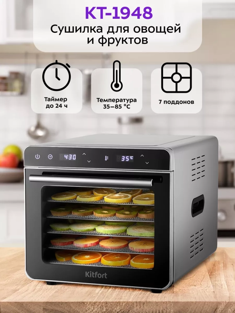 Электрическая сушилка для овощей и фруктов Kitfort КТ-1948 мощностью 700 Вт — это идеальное решение для сушки различных продуктов. Она предназначена для обработки овощей, фруктов, ягод, грибов, корнеплодов, трав и зелени. Также она подходит для мяса и рыбы, а также хлеба. В комплекте идут 6 металлических поддонов и один поддон специально для жидкости.