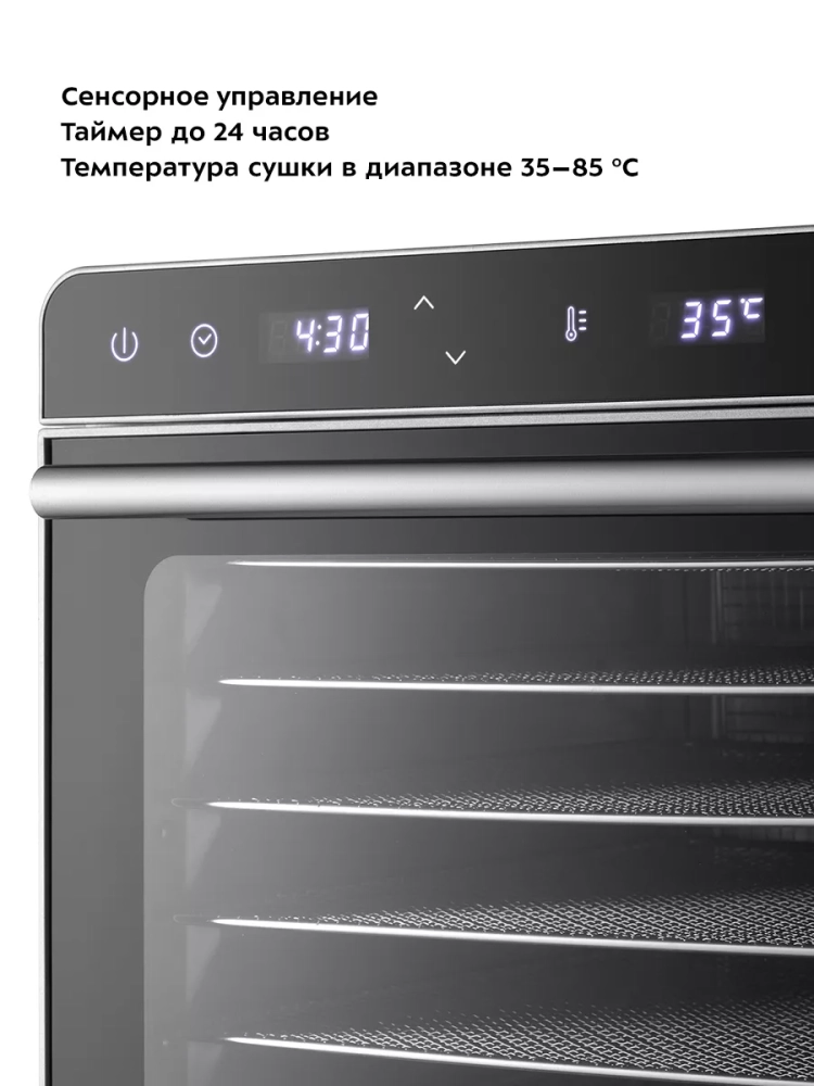 Температура сушки в этой модели может быть установлена в диапазоне от 35 до 85 градусов Цельсия с шагом в 5 градусов. Это позволяет точно настроить процесс под каждый тип продукта. Овощесушилка также оснащена таймером на срок до 24 часов работы с шагом в полчаса.
