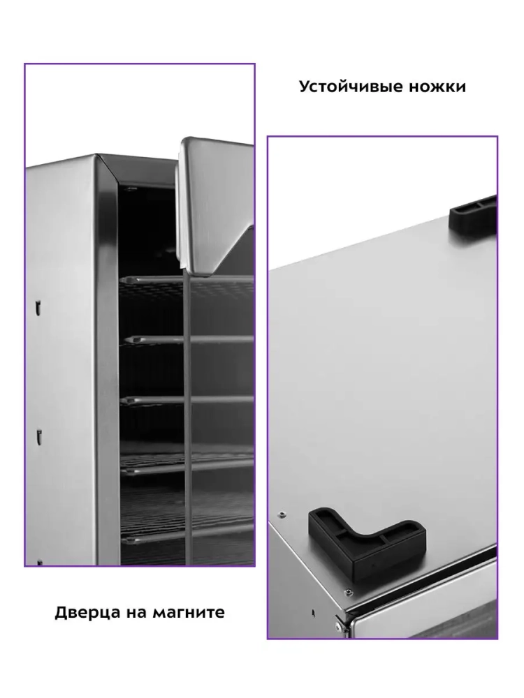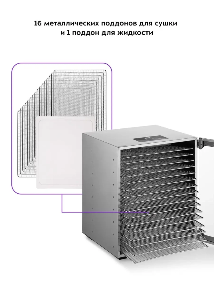 Сушилка имеет в комплекте 16 поддонов для сушки и 1 поддон для жидкости. Поддоны для сушки выполнены из нержавеющей стали.