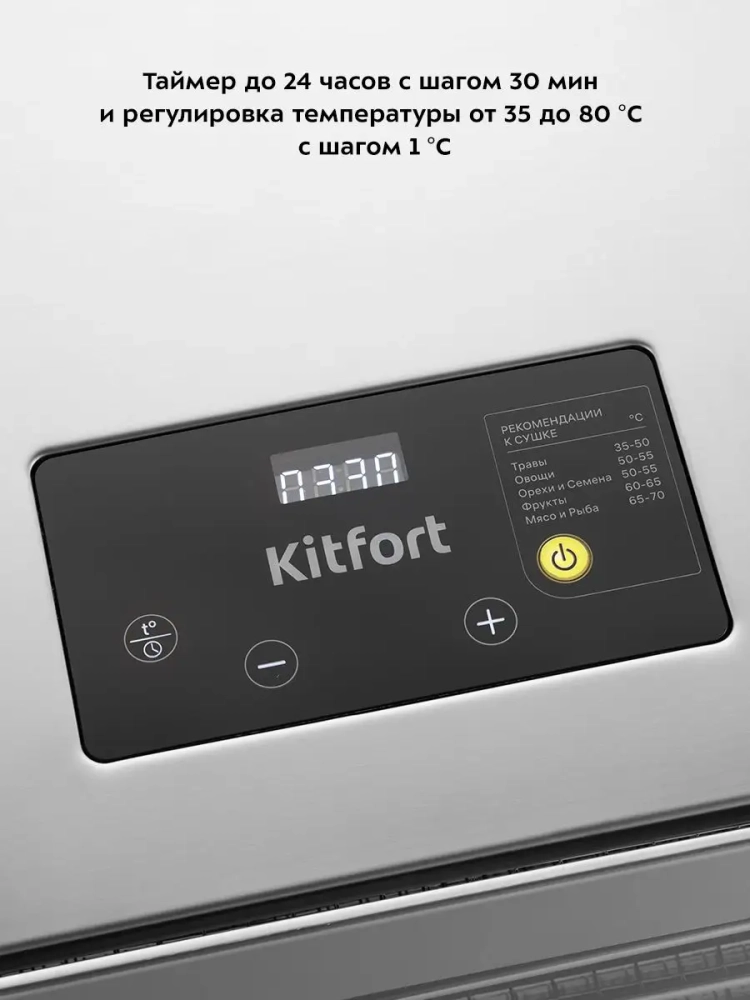 На сушилке можно установить температуру сушки в диапазоне 35–80 о*С с шагом 1 градус. Сушилка оснащена таймером до 24 часов работы с шагом 30 минут.