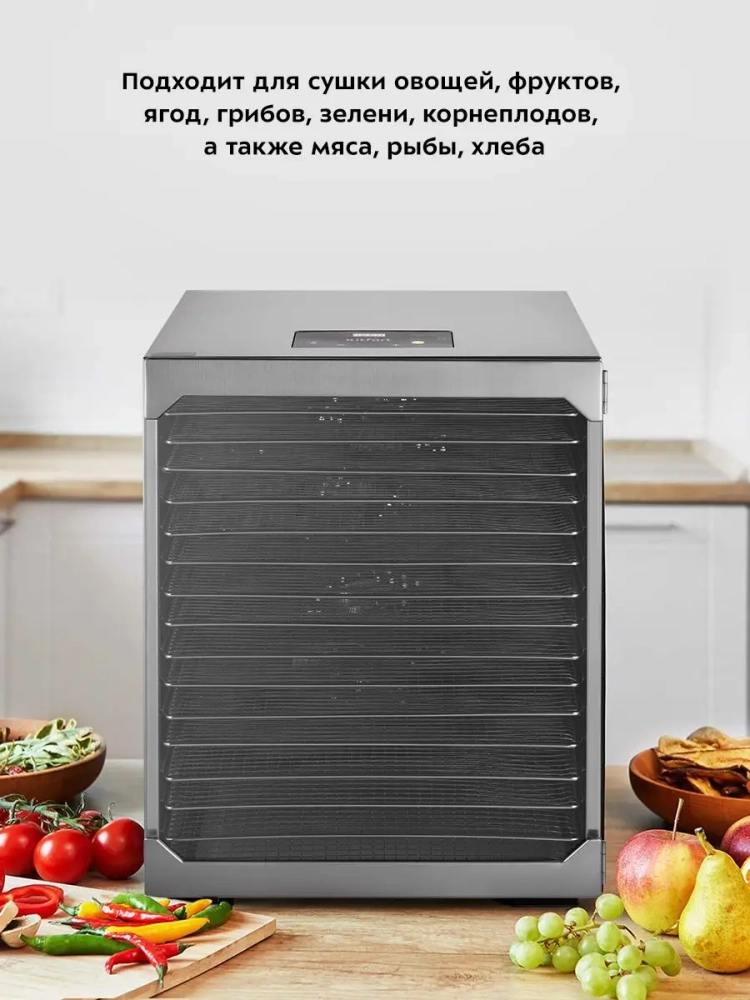 Электрическая сушилка Kitfort КТ-1956 предназначена для сушки овощей, фруктов, ягод, грибов, корнеплодов, трав и зелени, а также мяса и рыбы, хлеба.