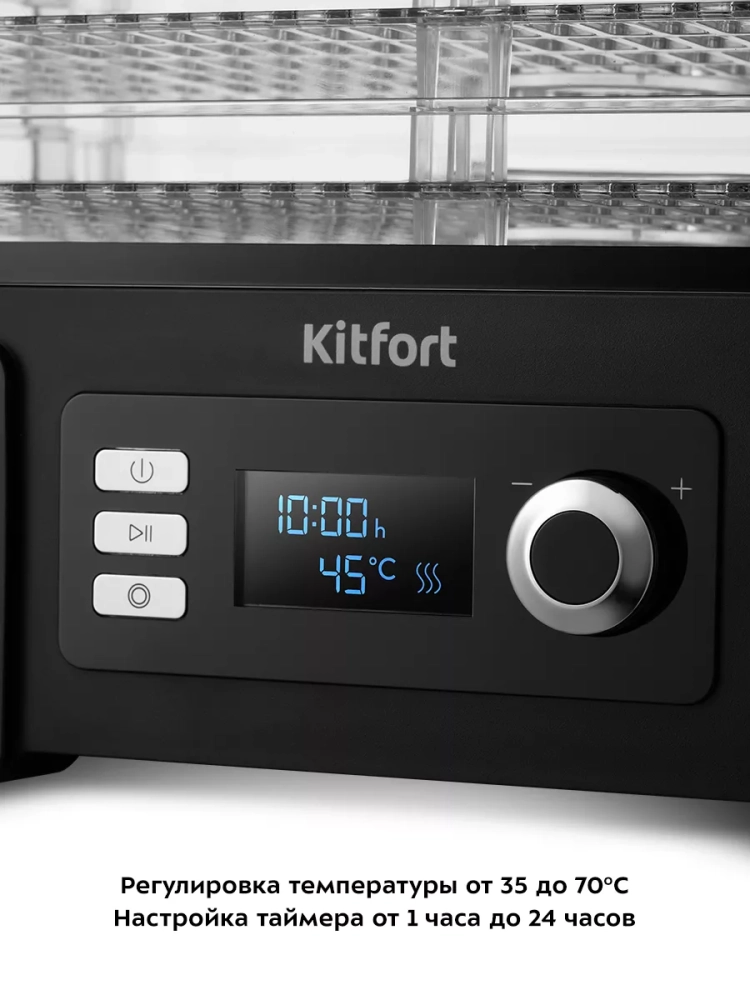 На передней панели электросушилки расположен регулятор температуры с диапазоном от 35 до 70 градусов Цельсия с шагом в 5 градусов. Это позволяет точно настроить условия сушки для различных типов продуктов. Таймер работы можно установить на период от одного часа до суток с шагом в полчаса.