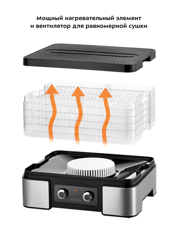 Электрическая сушилка Kitfort КТ-1958 предназначена для сушки овощей, фруктов, ягод, грибов, корнеплодов, трав и зелени, а также хлеба.