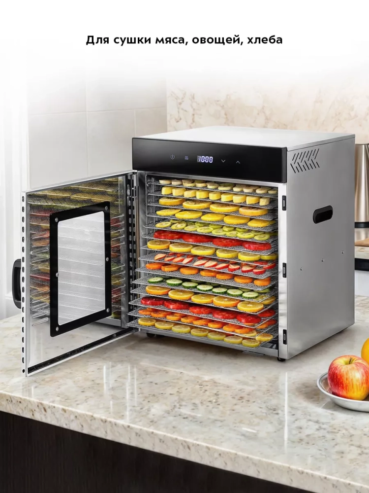 Электрическая сушилка Kitfort КТ-1967 предназначена для сушки овощей, фруктов, ягод, грибов, корнеплодов, трав и зелени, а также мяса и рыбы, хлеба.