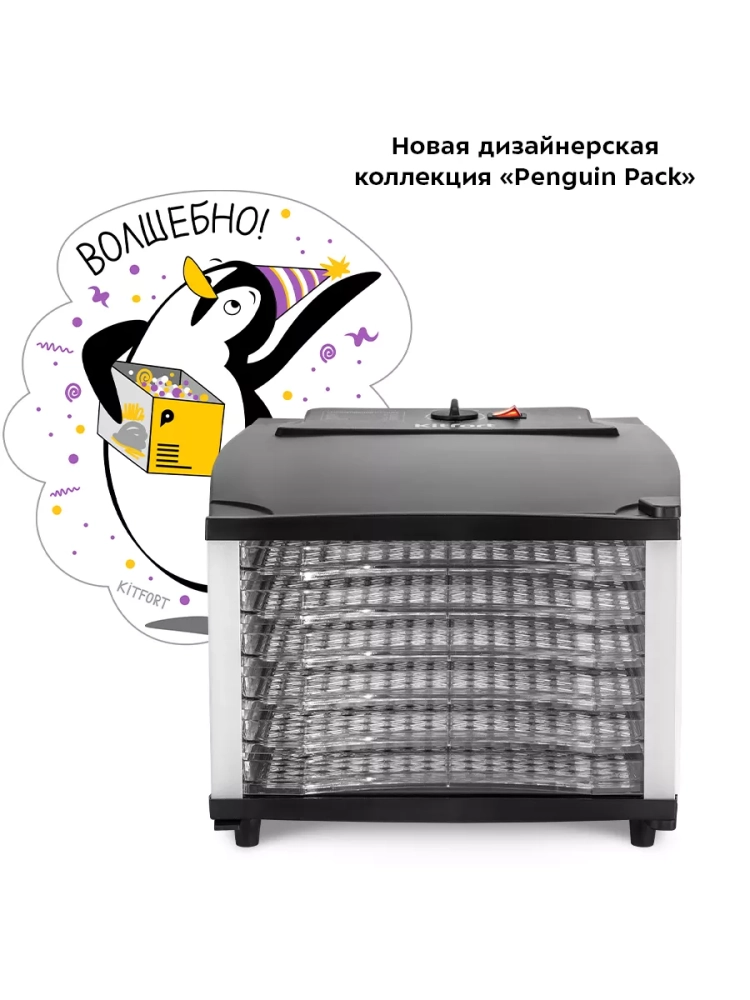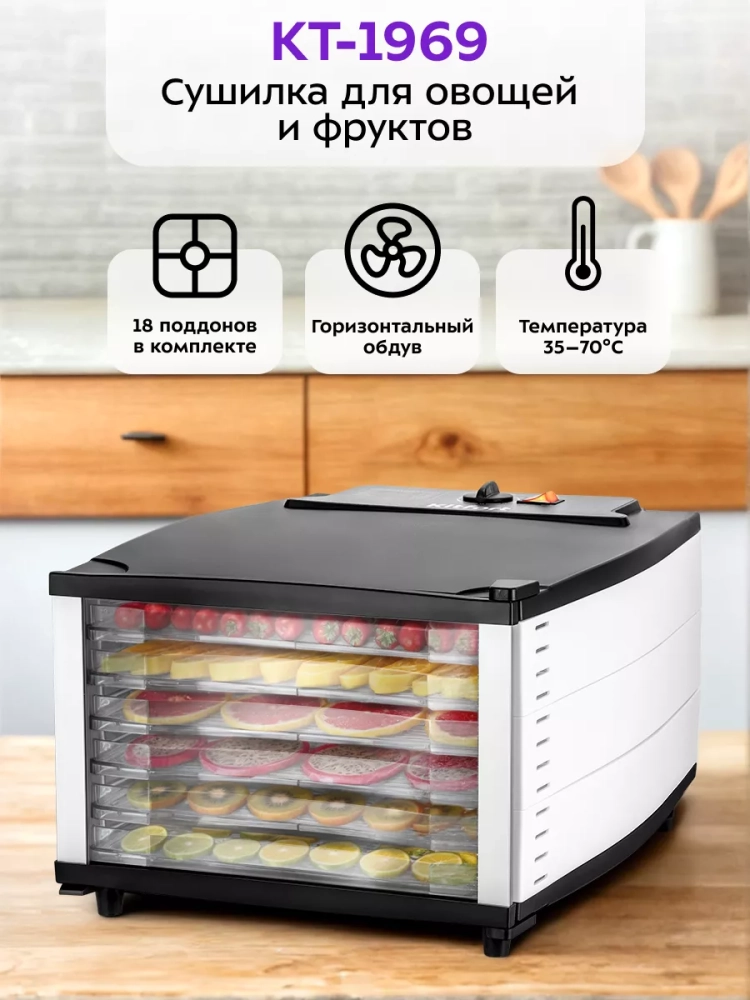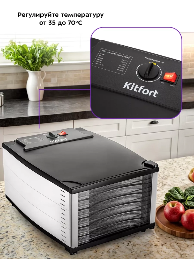 Электрическая сушилка Kitfort КТ-1969 предназначена для сушки овощей, фруктов, ягод, грибов, корнеплодов, трав и зелени, а также хлеба.