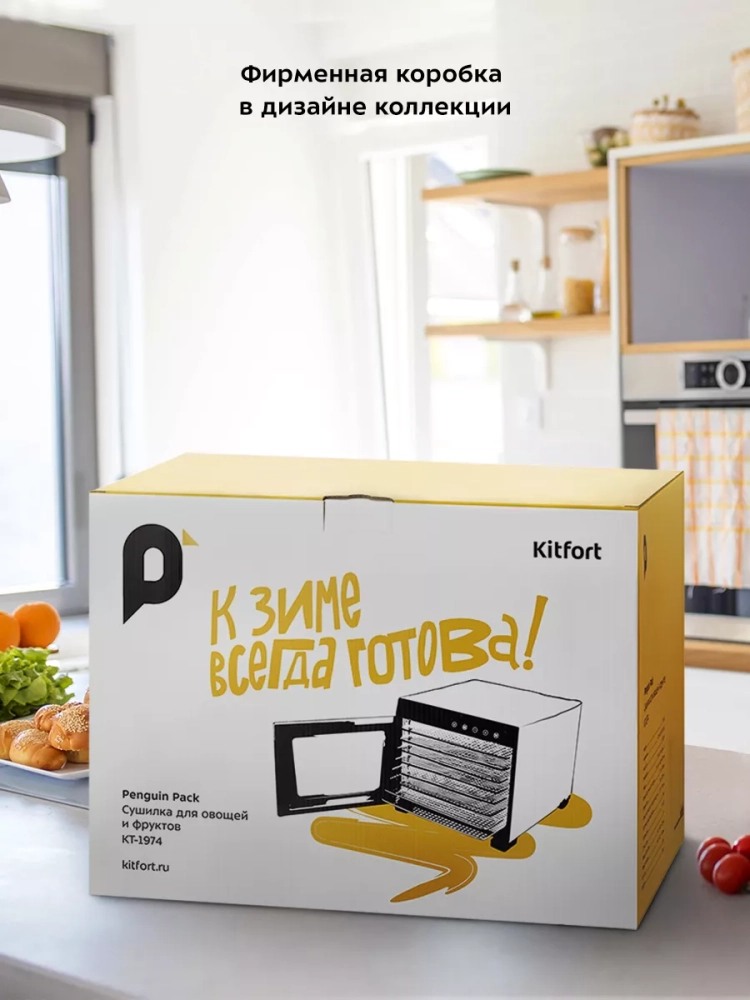 Электрическая сушилка Kitfort КТ-1974 предназначена для сушки овощей, фруктов, ягод, грибов, корнеплодов, трав и зелени, а также мяса и рыбы, хлеба.