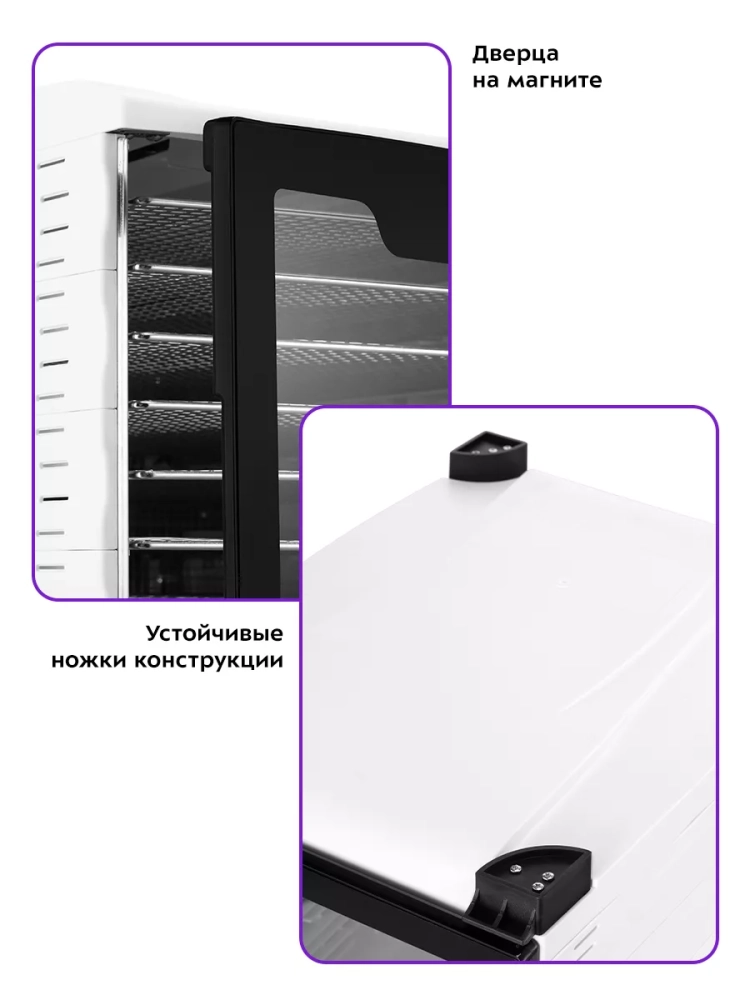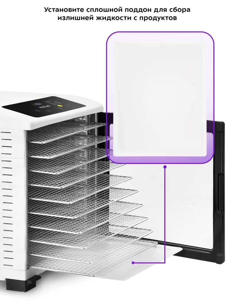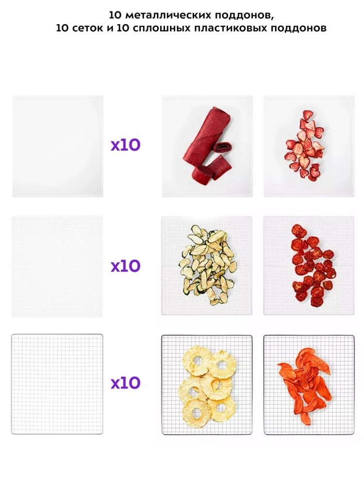 Сушилка имеет в комплекте 10 металлических поддонов, 10 сеток для мелких продуктов и 10 пластиковых сплошных поддонов.