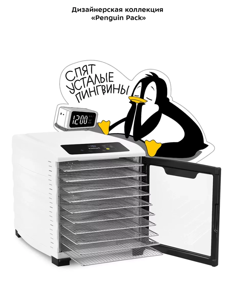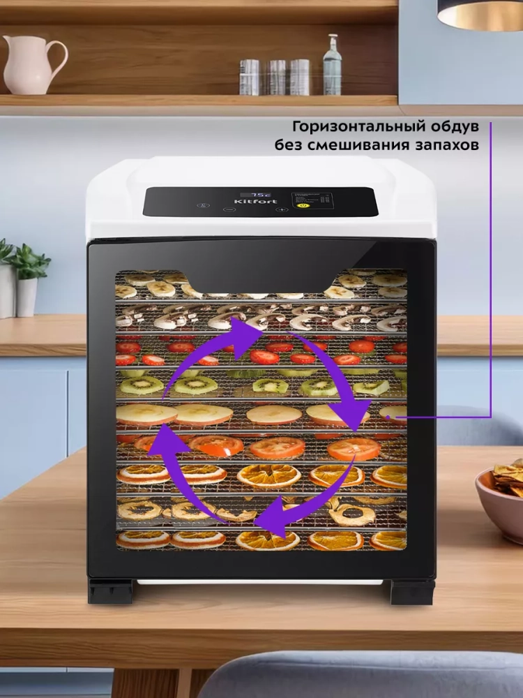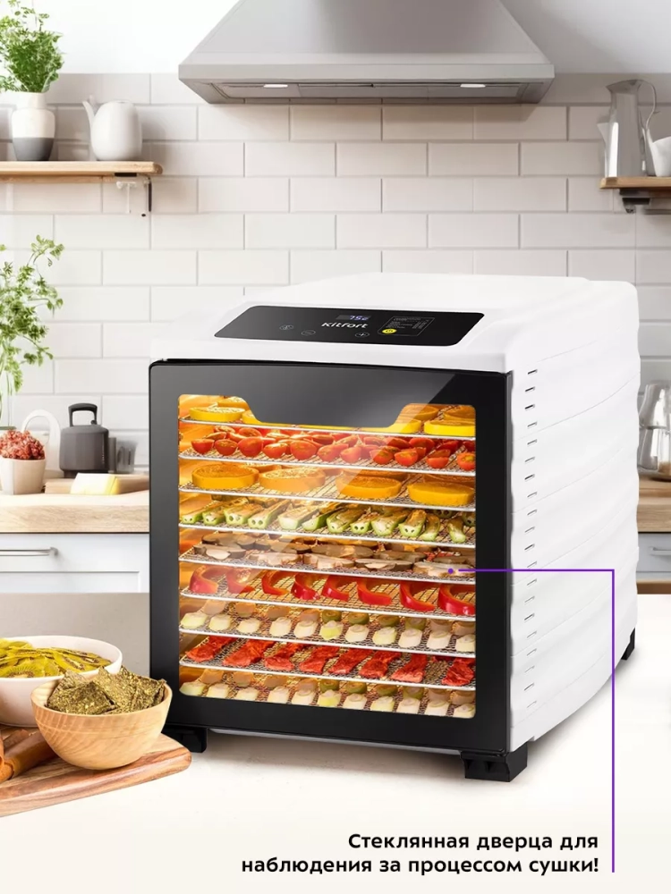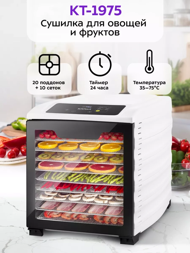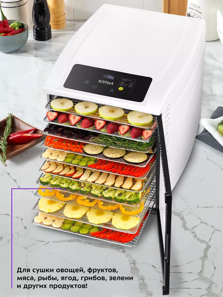 Электрическая сушилка Kitfort КТ-1975 предназначена для сушки овощей, фруктов, ягод, грибов, корнеплодов, трав и зелени, а также мяса и рыбы, хлеба.