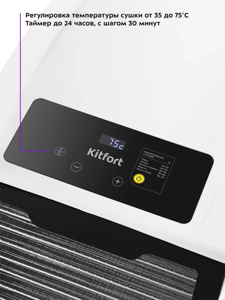 Температуру сушки можно изменить от 35 до 75 °С с шагом 1 °С. Сушилка оснащена таймером до 24 часов работы с шагом 30 минут.