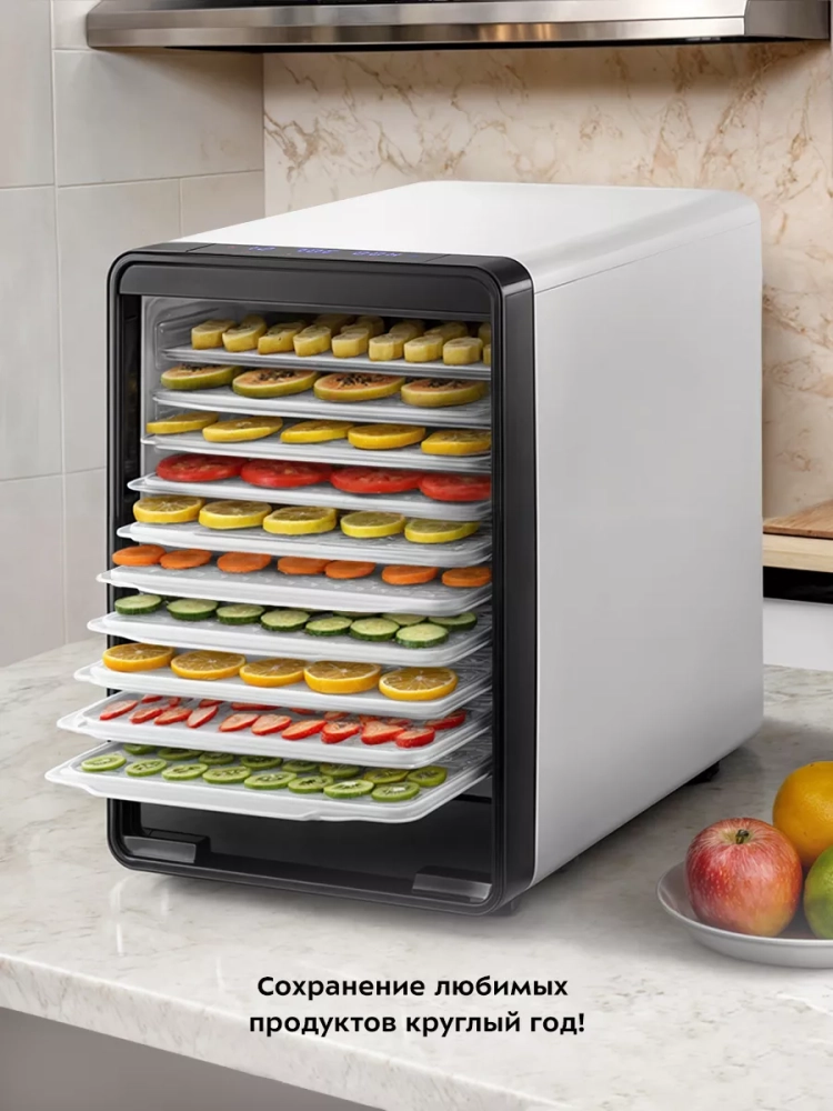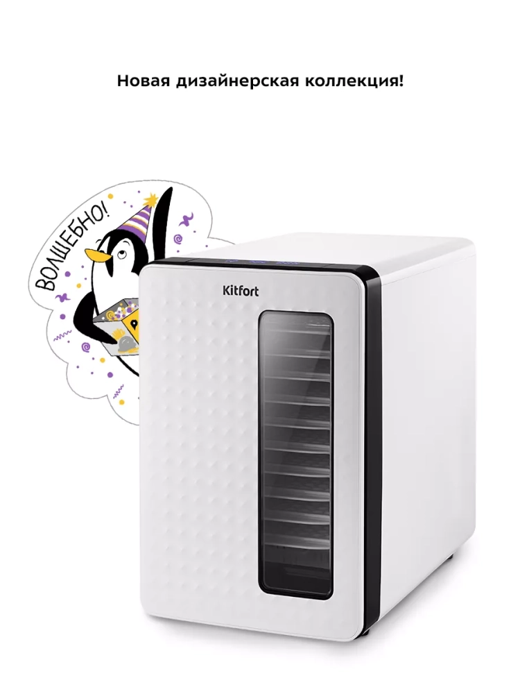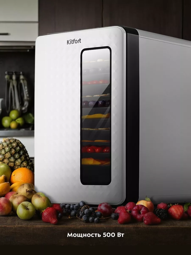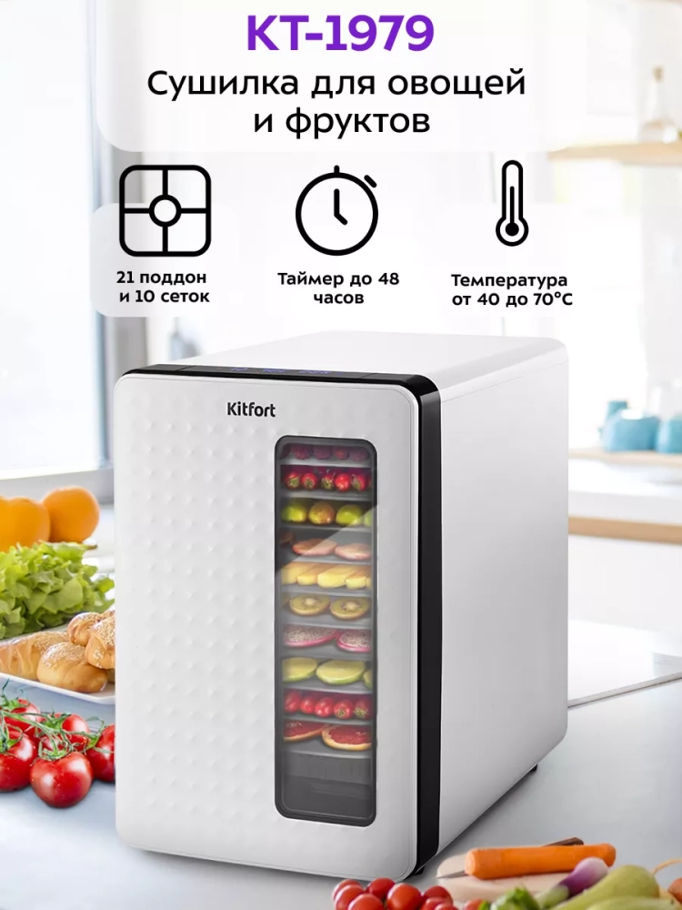 Электрическая сушилка для овощей и фруктов Kitfort КТ-1979 предназначена для сушки овощей, фруктов, ягод, грибов, корнеплодов, трав и зелени, а также хлеба.