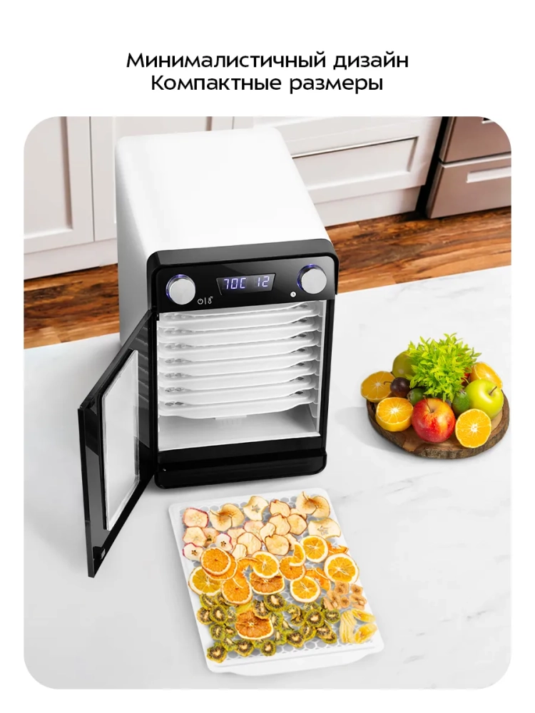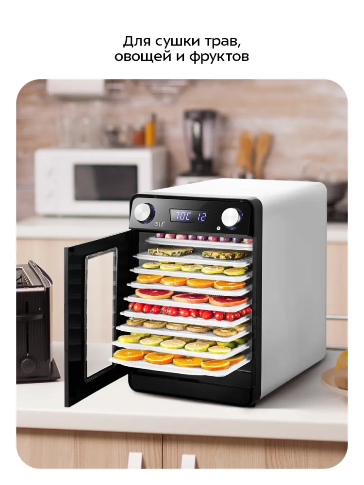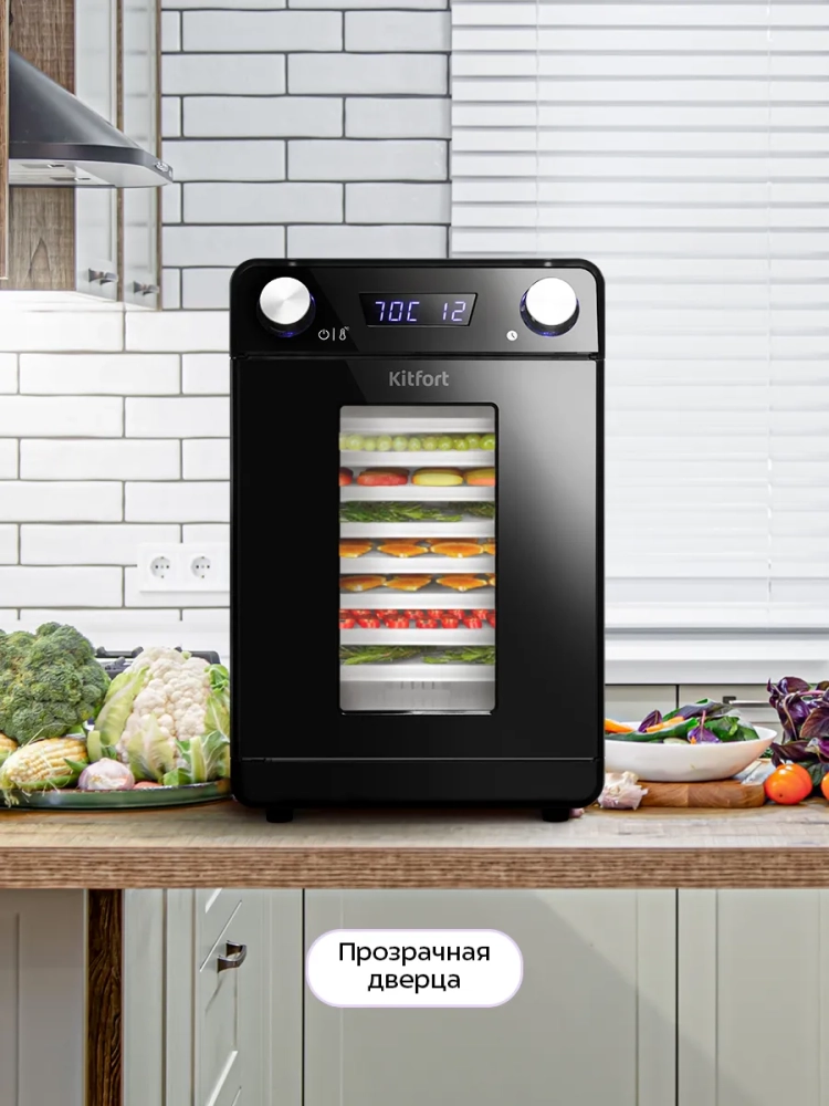 Электрическая сушилка для овощей и фруктов Kitfort КТ-1981 предназначена для сушки овощей, фруктов, ягод, грибов, корнеплодов, трав и зелени, а также хлеба.